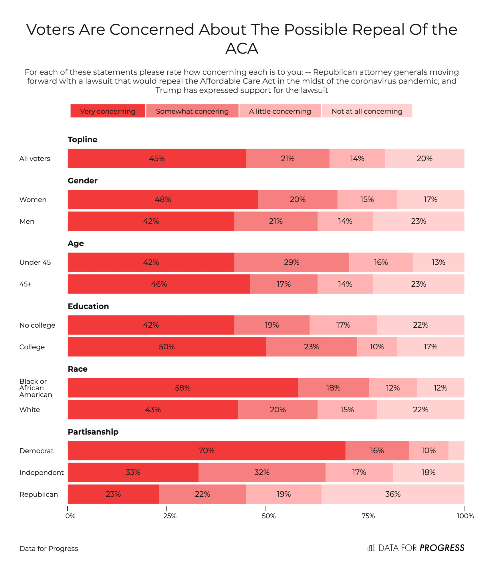 - Voters also report high levels of concern about President Trump and the Republican Party’s efforts to cut the social safety net in the midst of this crisis with 45 percent very concerned that the Supreme Court will strike down the Affordable Care Act and 48 percent concerned about the administration’s plan to remove 700,000 people from nutrition assistance programs.