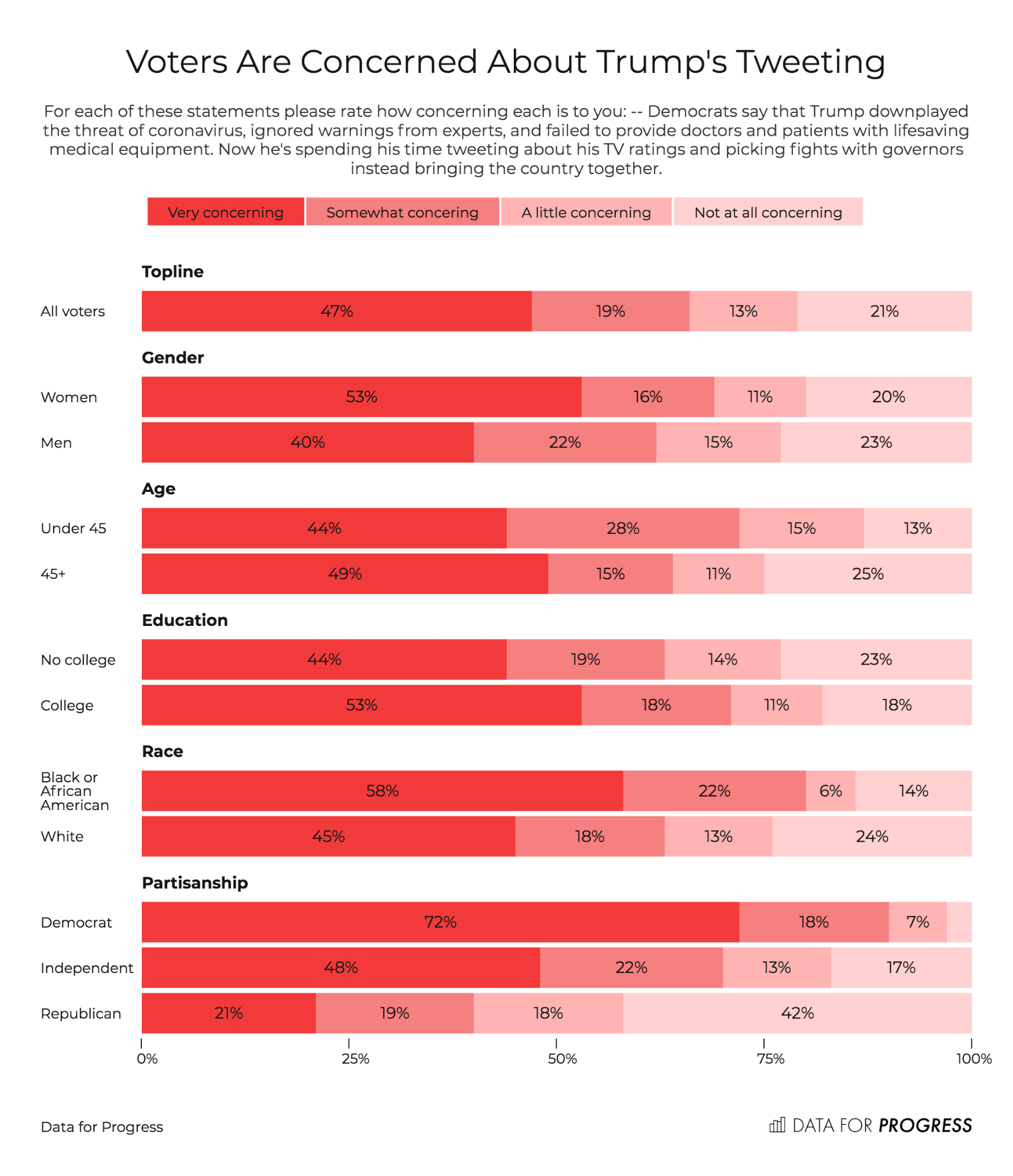 This next chart depicts demographic and partisan breakdowns of answers to a question aimed at gauging voters’ attitudes about Trump’s personal behavior—namely, picking fights with governors. The fact that 53 percent of women are very concerned about this, compared to only 40 percent of men, is an especially noteworthy finding. Here, opinions are largely correlated with partisanship: 72 percent of self-identified Democrats are very concerned, compared to 48 percent of self-identified independents, and 21 percent of self-identified Republicans.
