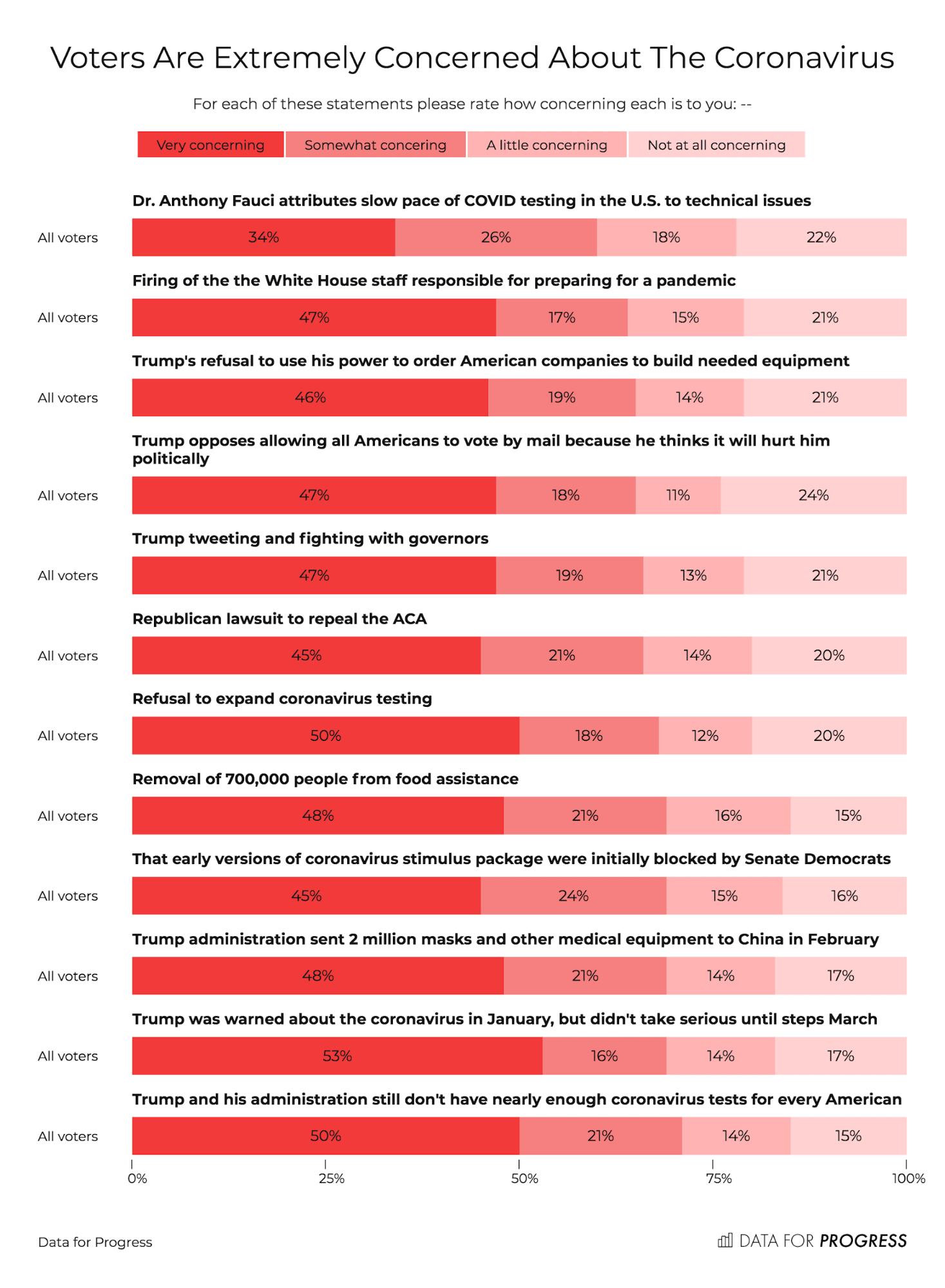 In an April 2020 survey, Data for Progress sought to gauge how voters have greeted these developments. We asked voters 12 questions and then provided them four response options: “very concerned,” “somewhat concerned,” “a little concerning,” and “not at all concerned.” These questions covered a range of topics. For instance, we asked voters about Trump’s handling of the coronavirus, including his delayed response, decision to send medical supplies to China, and his failure to make adequate testing available. We also probed attitudes toward some of the other policies the Trump administration and Republican Party are pursuing at present, such as removing 700,000 people from food assistance programs as well as a Trump-backed lawsuit that could result in the elimination of the Affordable Care Act (ACA). If Trump gets his way, these policy changes will devastate Americans already hit hard by a worsening economic situation. We also looked at voters’ attitudes toward Trump’s attack on the idea of conducting elections via vote-by-mail.