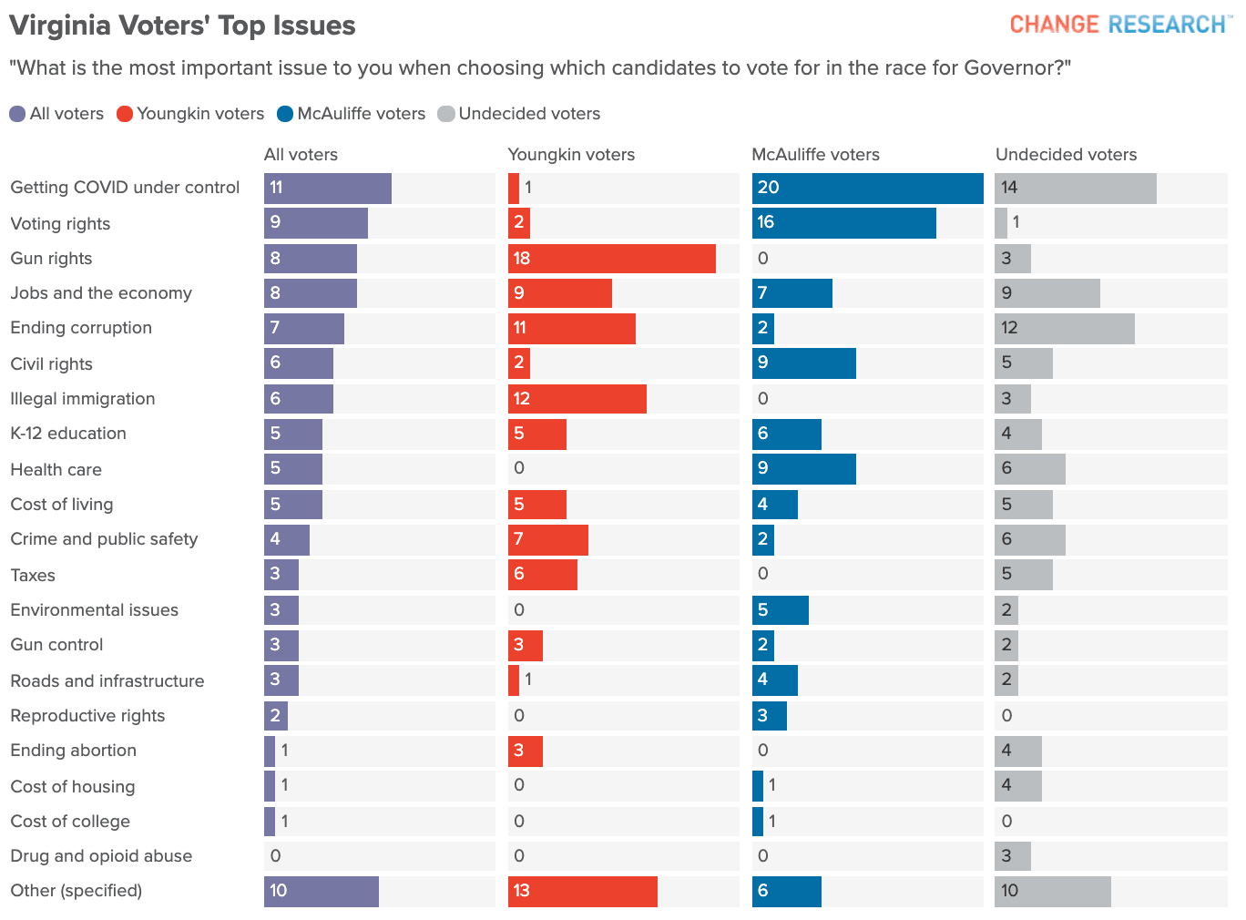 - Hot-button right-wing issues are keeping this race close. Youngkin voters’ top issues are guns and illegal immigration. And over 90% of Youngkin voters believe that critical race theory, illegal immigration, voter fraud, and socialism pose significant threats to Virginia. By contrast, 81% of McAuliffe voters say voter suppression is a threat (along with over 90% of McAuliffe voters who think climate change and white supremacy are threats).