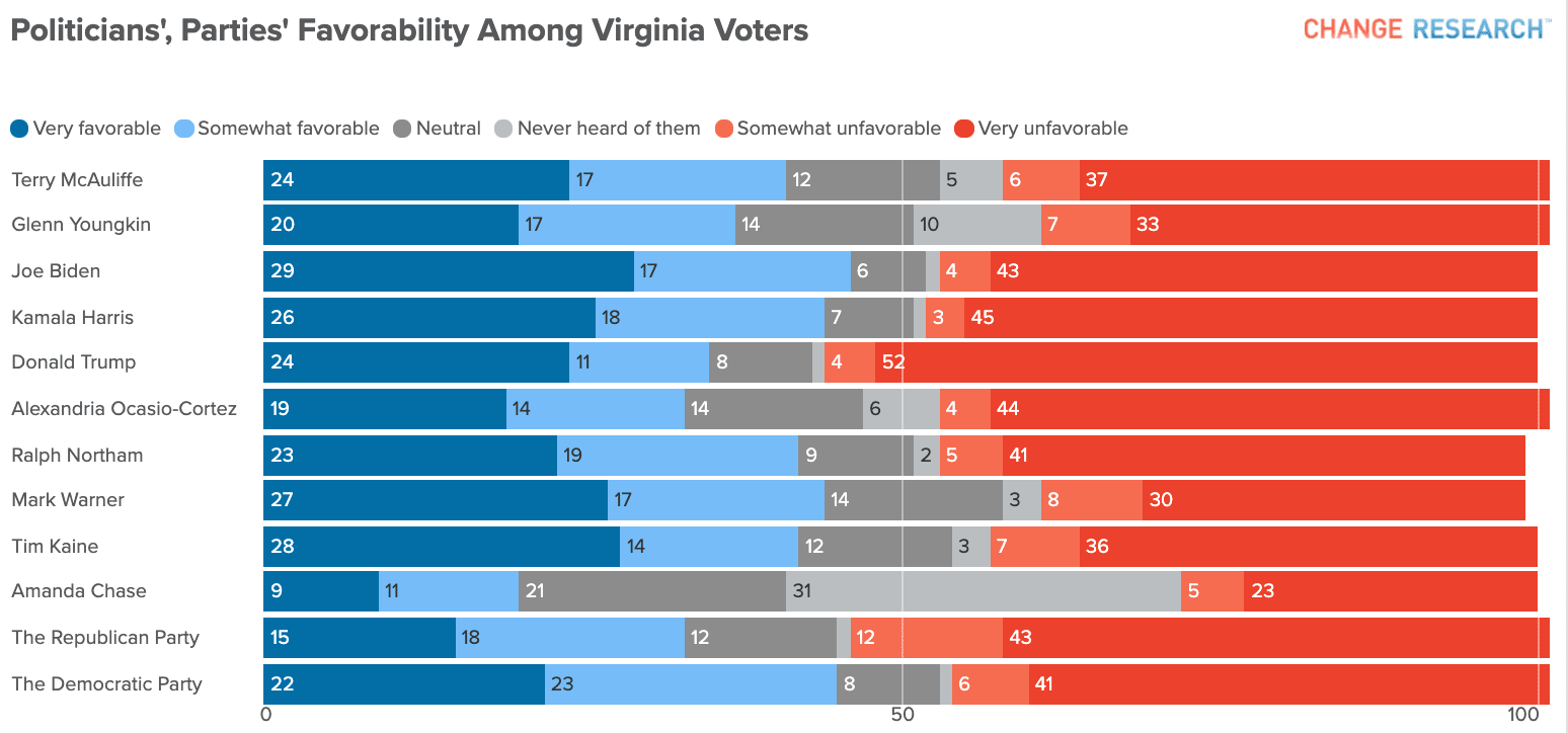 - Terry McAuliffe leads 49-43, with 3% supporting Blanding and 5% undecided. McAuliffe is significantly underperforming Biden among young voters and Hispanics.
