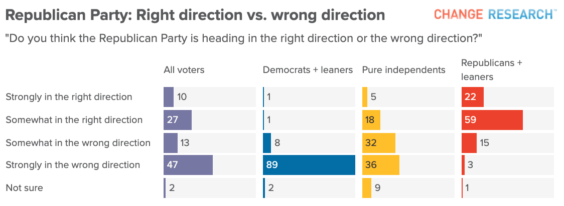 Overall, 47% of voters believe the Democratic Party is headed in the right direction, while 51% say it’s going in the wrong direction. There’s very strong polarization between members of the two parties. Notably, 59% of independents who lean toward neither party say Democrats are headed strongly in the wrong direction.