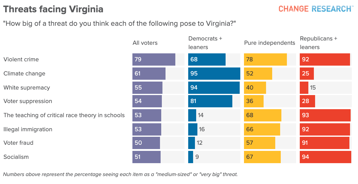 Overall, Virginians see their greatest threat as violent crime, with 79% saying it’s at least a medium-sized threat. The only other threat seen as medium-sized or larger by more than 60% of voters is climate change. All other items—from voter suppression to voter fraud, illegal immigration to white supremacy to socialism to critical race theory—evenly divide Virginia voters.