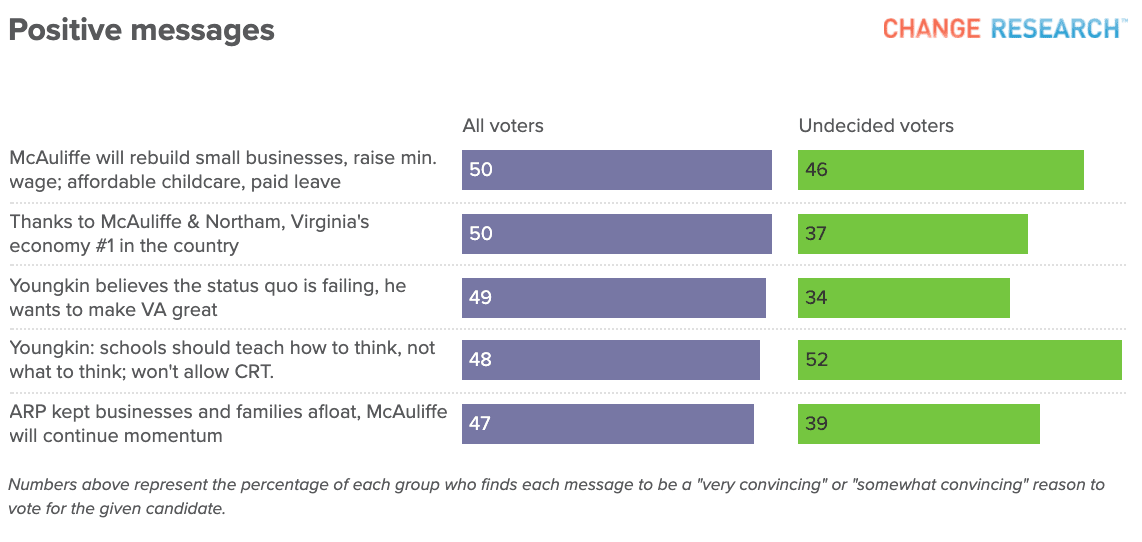 Critical race theory is a concern for a substantial number of voters in Virginia, including undecided voters. 52% of undecided voters—along with 35% of Biden voters who are not planning to support McAuliffe—say it’s at least a medium-sized threat. Messaging about Youngkin never allowing critical race theory to be taught in Virginia schools was the most effective pro-Youngkin message among all voters and undecided voters.