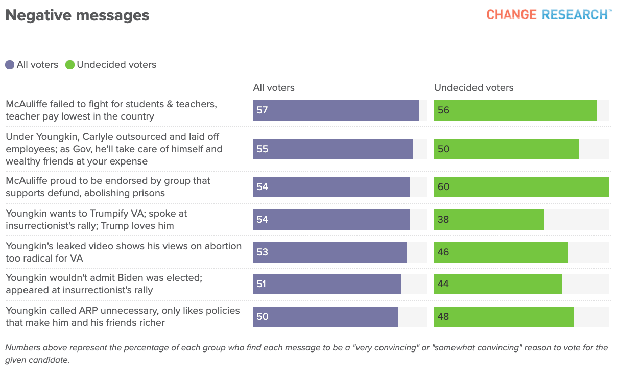 The two anti-Youngkin messages that best persuade undecided voters both make the same point: that Youngkin will take care of himself and his wealthy friends at the expense of Virginian families. The one which uses his work at Carlyle as a frame is more effective with all voters than the other, which mentions Youngkin’s comment about the American Rescue Plan being “unnecessary.”