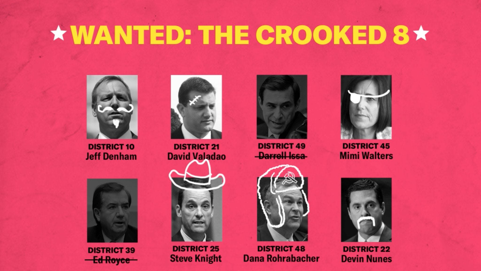 Anyway, the California primary is less than a month away, on June 5th. So we’re asking all the Friends of the Pod out there to help us back up the eventual Democratic challengers and build a ground game that will kick the Crooked 8 out of office.