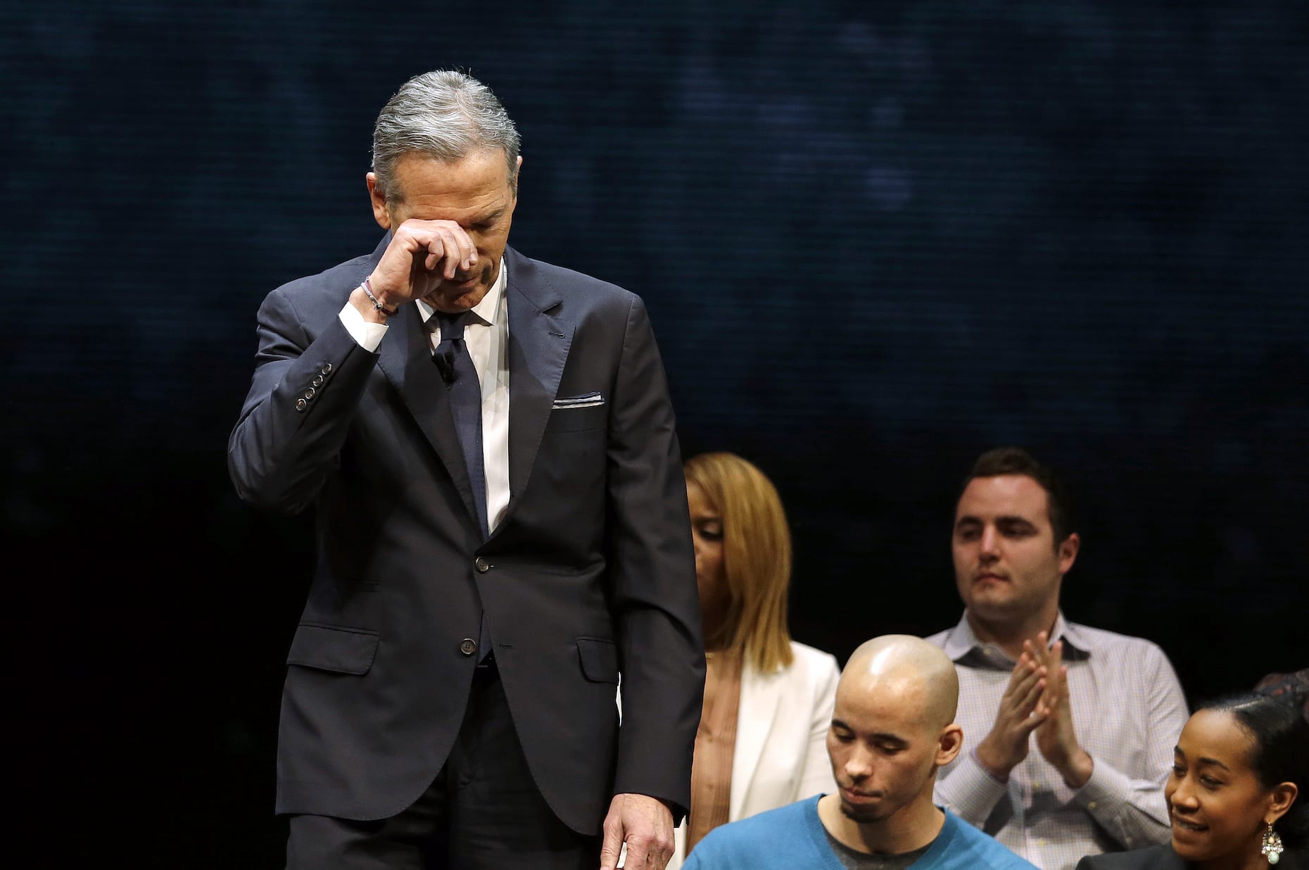 FILE - In this March 22, 2017, file photo, Starbucks CEO Howard Schultz wipes at his eyes after listening to an employee speak of her experience of going to Charleston, S.C., in the aftermath of a mass shooting at a church there in 2015, during a forum at Starbucks annual shareholders meeting in Seattle. For someone who has given about $150,000 to Democratic campaigns over the years, Schultz is generating tepid, or even hostile, responses within the party as he weighs a presidential bid in 2020. That's because reports have suggested he's considering running as an independent, a prospect that could draw support away from the eventual Democratic nominee and hand President Donald Trump another four years in office, many fret.(AP Photo/Elaine Thompson, File)