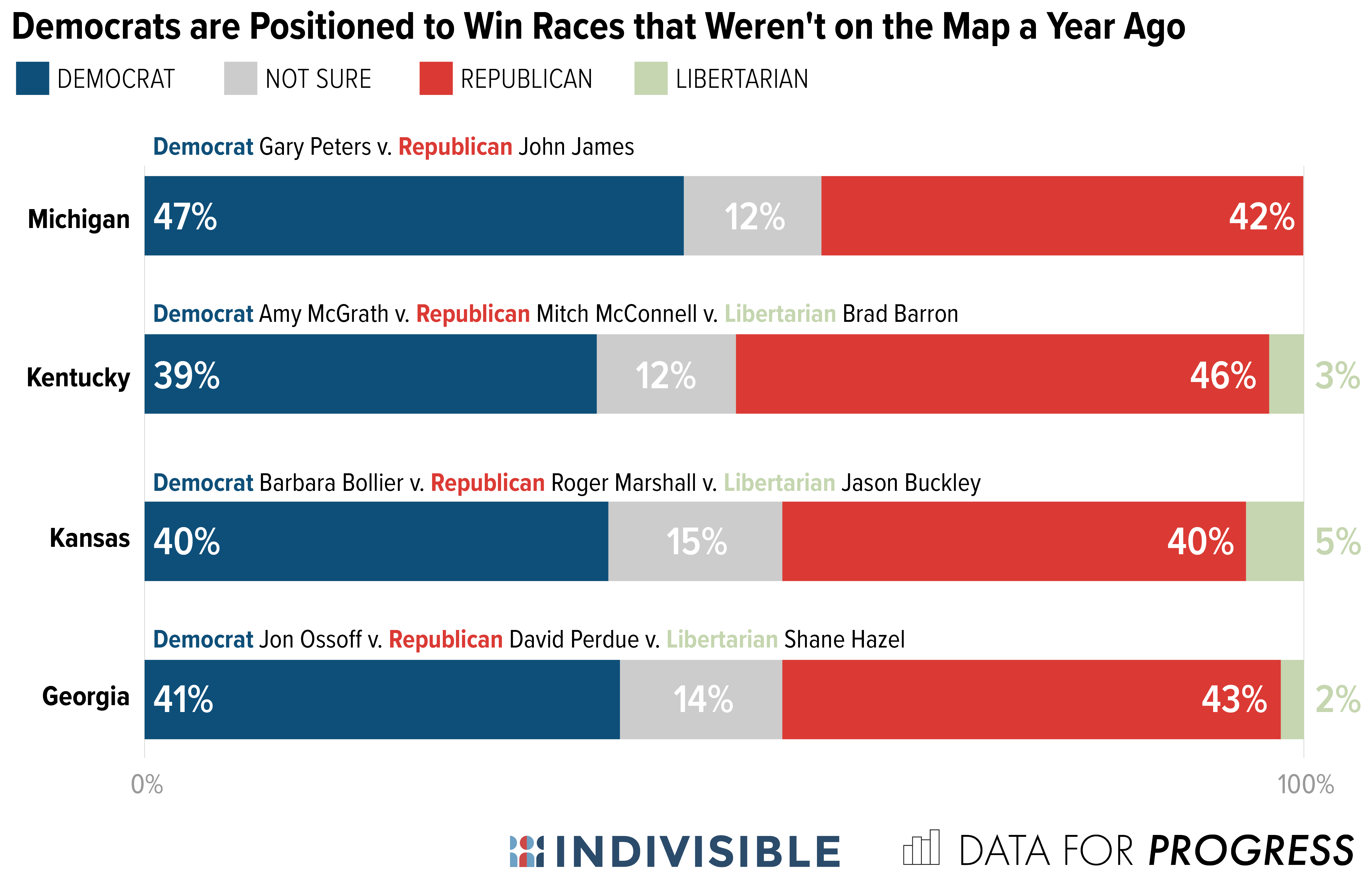We’ve known for a long time that this Senate election will not be decided in just a few states. Today, we’re excited to announce a partnership between Indivisible and Data for Progress to provide high-quality public-opinion polls. The Data For Progress methodology of contacting voters via text messages and through online surveys has been highly accurate the past few years.