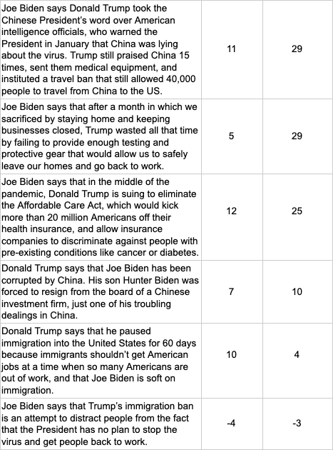 Trump’s message about China was the best performer overall. The message, detailed below, was the most effective with the entire electorate by a five-point margin. But the message performed almost identically to Biden’s messages on China with undecided voters, suggesting that Biden can play Trump to a draw on the issue. And encouragingly, voters are more receptive to the idea that Ivanka’s dealings with China are corrupt than that Hunter Biden’s were.