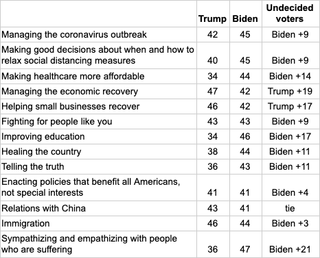 Undecided voters trust Biden over Trump on everything but managing the economic recovery and helping small businesses recover.