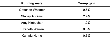 Veepstakes! We tested the short list of vice presidential candidates to determine their effect on the overall race between Biden and Trump, and it was very small. For all but Stacey Abrams, Trump gained between 0.5 and 1.2 points over his initial margin. For Abrams, he gained 3 points. This may have to do with her lower name recognition, though Klobuchar’s name recognition is not much higher than Abrams’s.