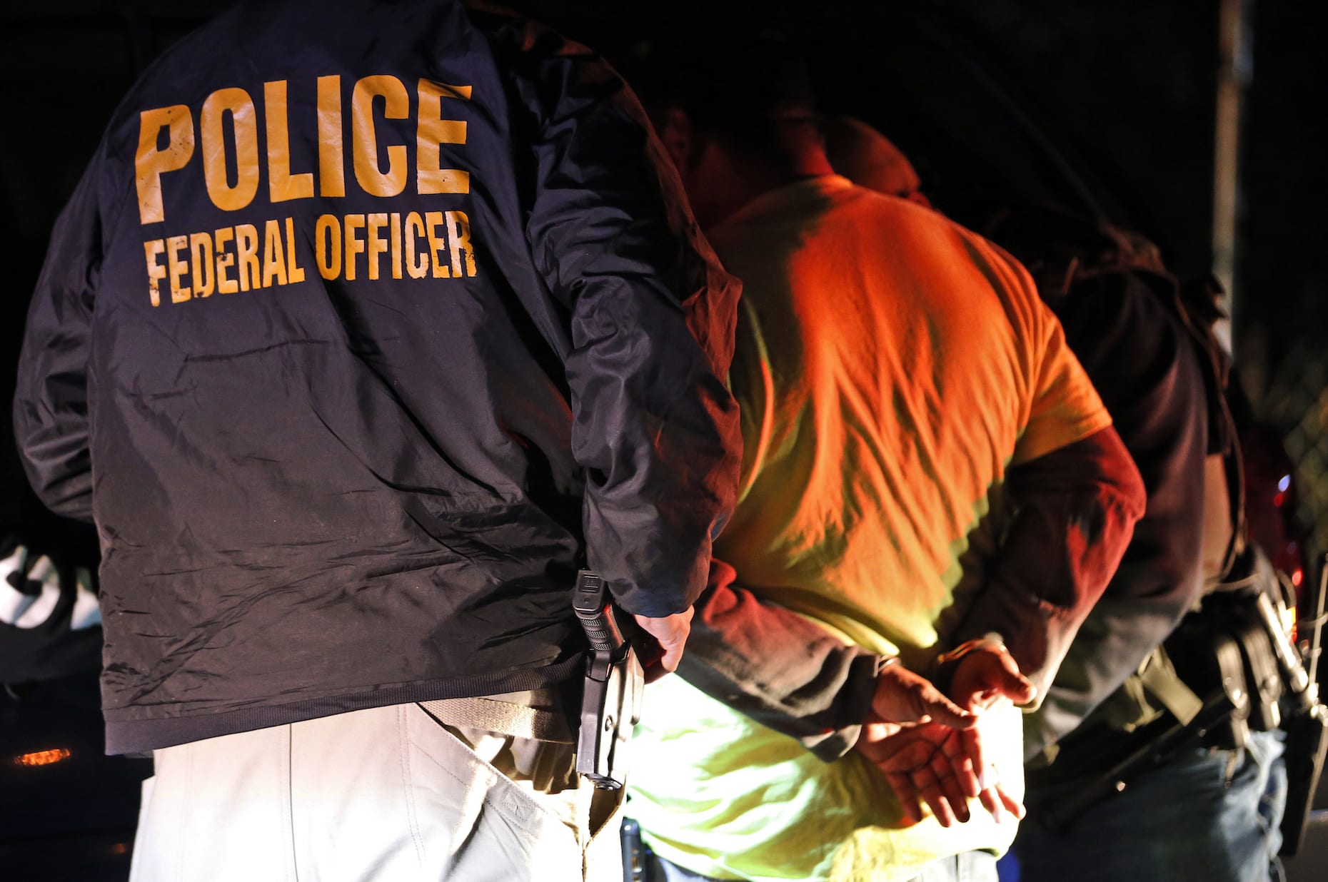 In this Oct. 22, 2018, photo U.S. Immigration and Customs Enforcement agents surround and detain a person during a raid in Richmond, Va. ICE's enforcement and removal operations, like the five-person field office team outside Richmond, hunt people in the U.S. illegally, some of whom have been here for decades, working and raising families. Carrying out President Donald Trump's hard-line immigration policies has exposed ICE to unprecedented public scrutiny and criticism, even though officers say they're doing largely the same job they did before the election, prioritizing criminals. (AP Photo/Steve Helber)