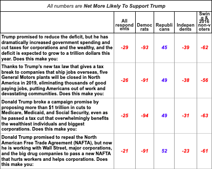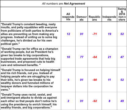 The statements about Trump’s chaotic leadership style and his faux populism are clear winners. They work with independents, swing voters and non-voters. They are also the only negative messages that we have tested that have any traction with Republicans.