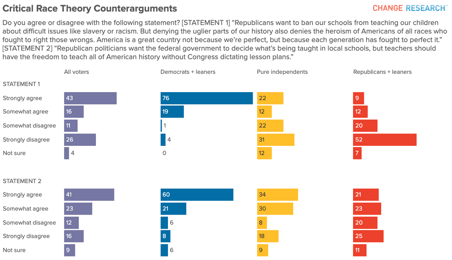 - Take on the Cultural Fights: I wish this were not the case, but the power of the right-wing media ecosystem and the tilt of the Facebook algorithm are such that Democrats cannot ignore absurd and often fictitious cultural fights. We must win them. In this poll, we tested two messages about critical race theory that defused the issue.