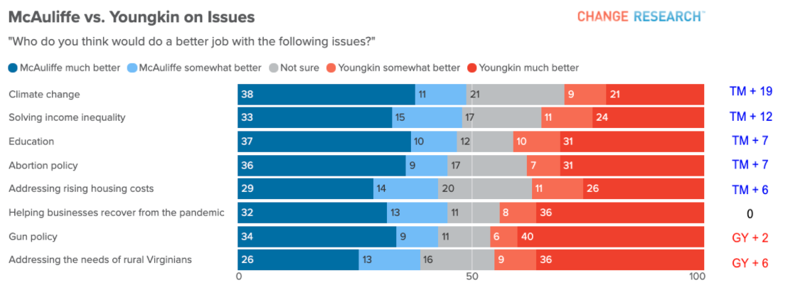 Terry McAuliffe is leading against Republican Glenn Youngkin 49-43. Being under 50 is never ideal, especially for a pseudo-incumbent like the former governor. However, while McAuliffe has work to do, he is well-positioned to recapture the governorship.