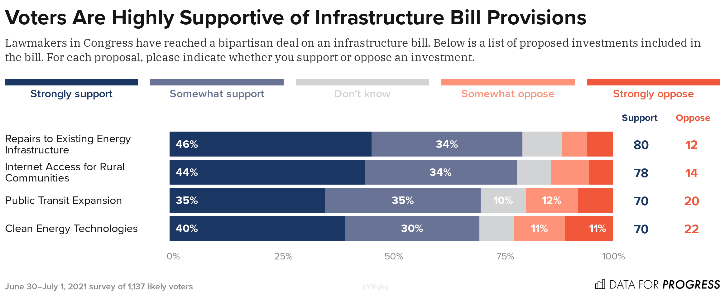 In a new survey of 1,137 likely voters from June 30th to July 1st, Data for Progress examined likely voter support towards the components of the infrastructure bill. Voters support each individual component of the proposed bill, with notable support across parties.