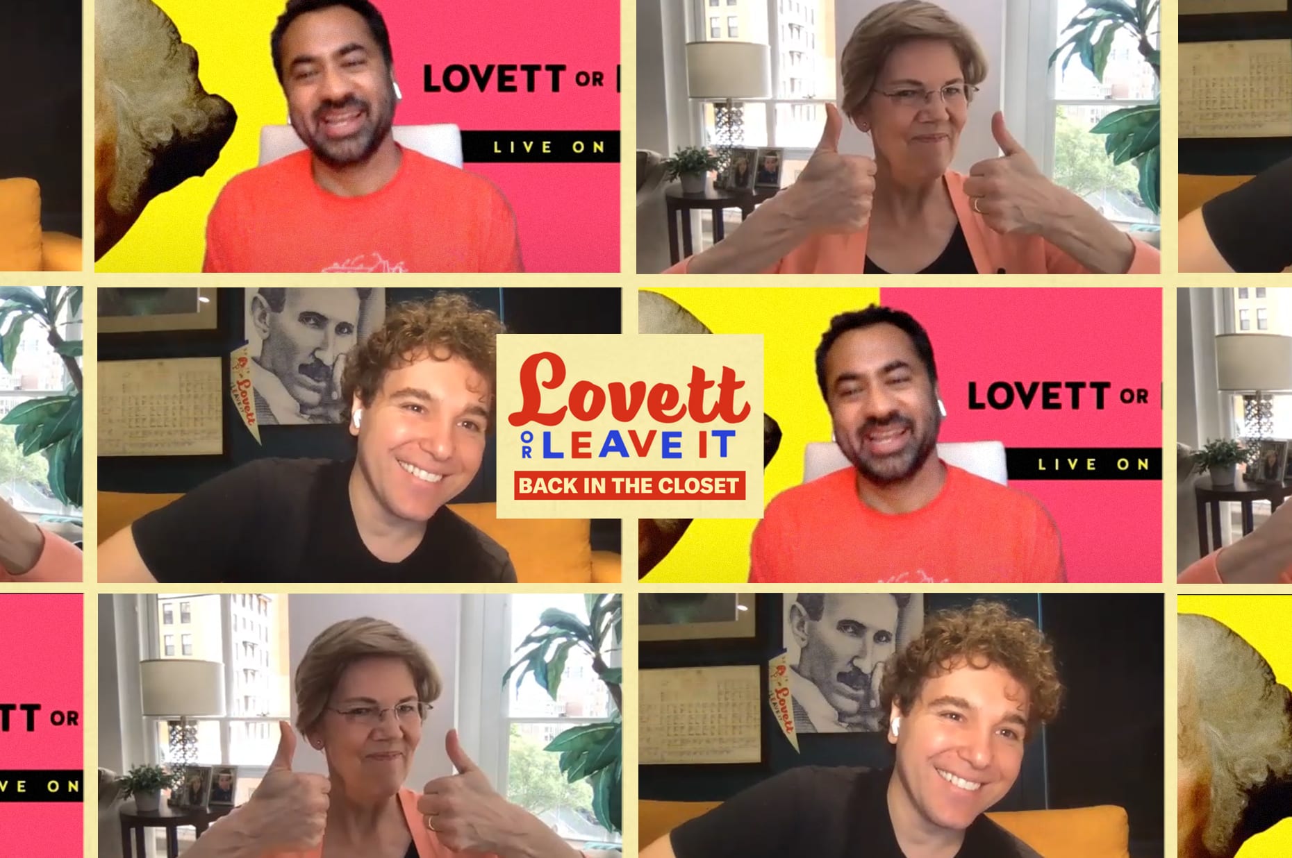 Senator Elizabeth Warren is here to talk about oversight, the pandemic response, and that question she won’t answer. Plus she sticks around as we quiz listeners. Kal Penn is back and judges the monologue. And Jon Millstein joins to deliver a zoom commencement. We also bring back the rant wheel and we hear your high notes. What a week. What a show.