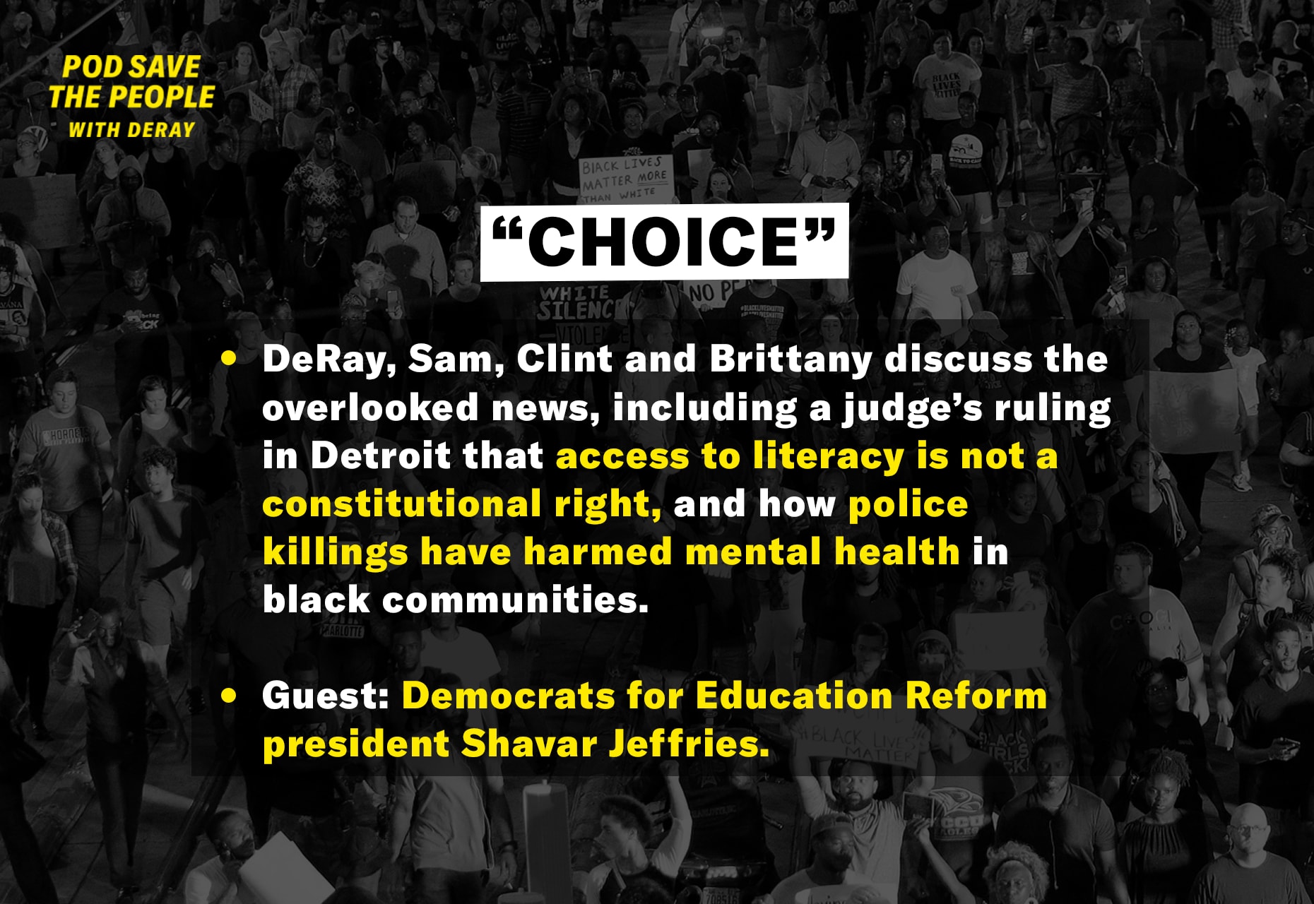DeRay, Sam, Clint, and Brittany discuss the overlooked news, including a judge’s ruling in Detroit that access to literacy is not a constitutional right, and how police killings have harmed mental health in black communities. Democrats for Education Reform president Shavar Jeffries joins DeRay and discusses DFER’s core work, what impact charter schools have on diversity, and why he thinks choice matters.