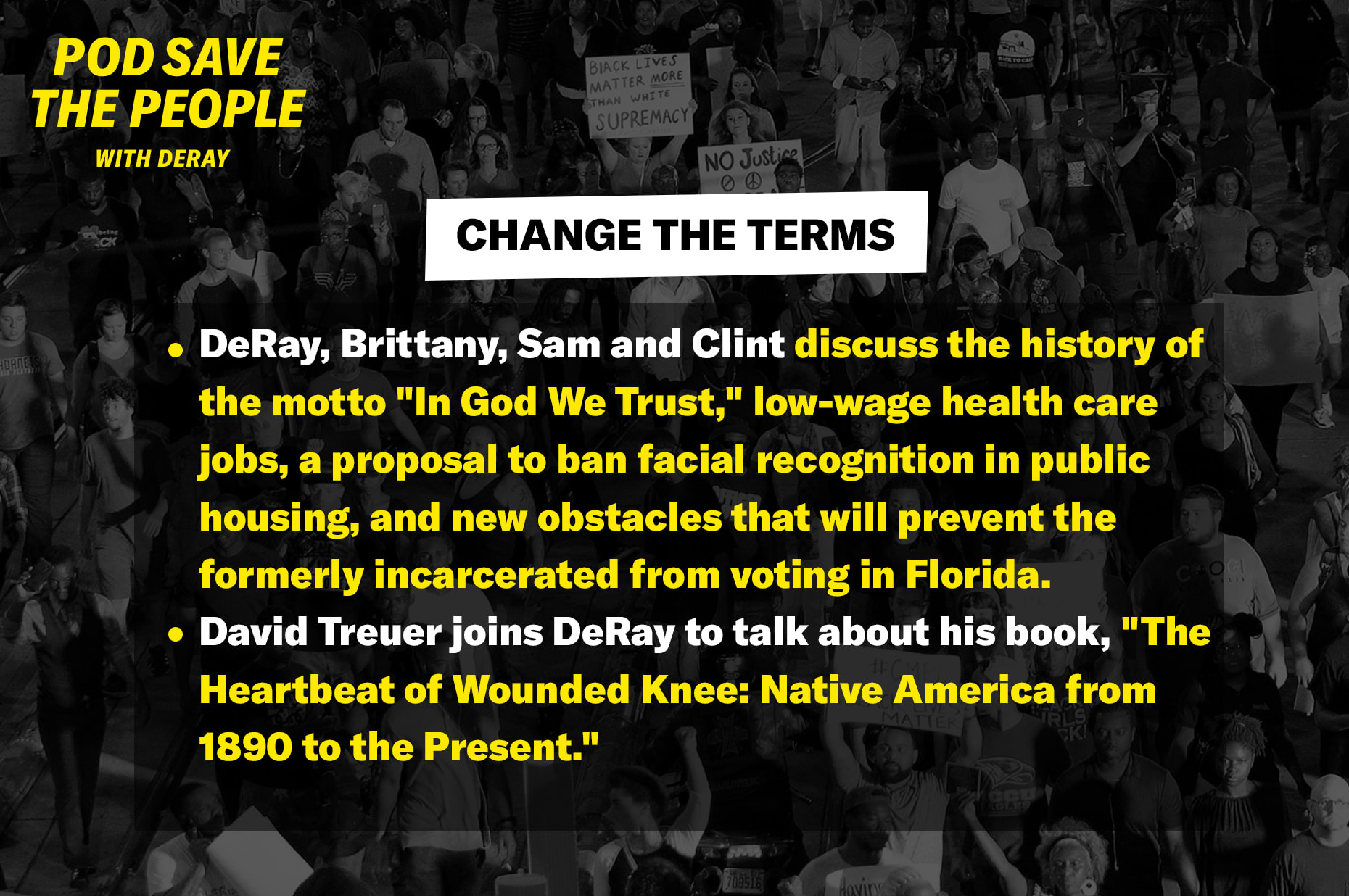DeRay, Brittany, Sam and Clint discuss the history of the motto “In God We Trust,” low-wage health care jobs, a proposal to ban facial recognition in public housing, and ensuring that formerly incarcerated Floridians maintain the right to vote. David Treuer joins DeRay to talk about his book, “The Heartbeat of Wounded Knee: Native America from 1890 to the Present.”
