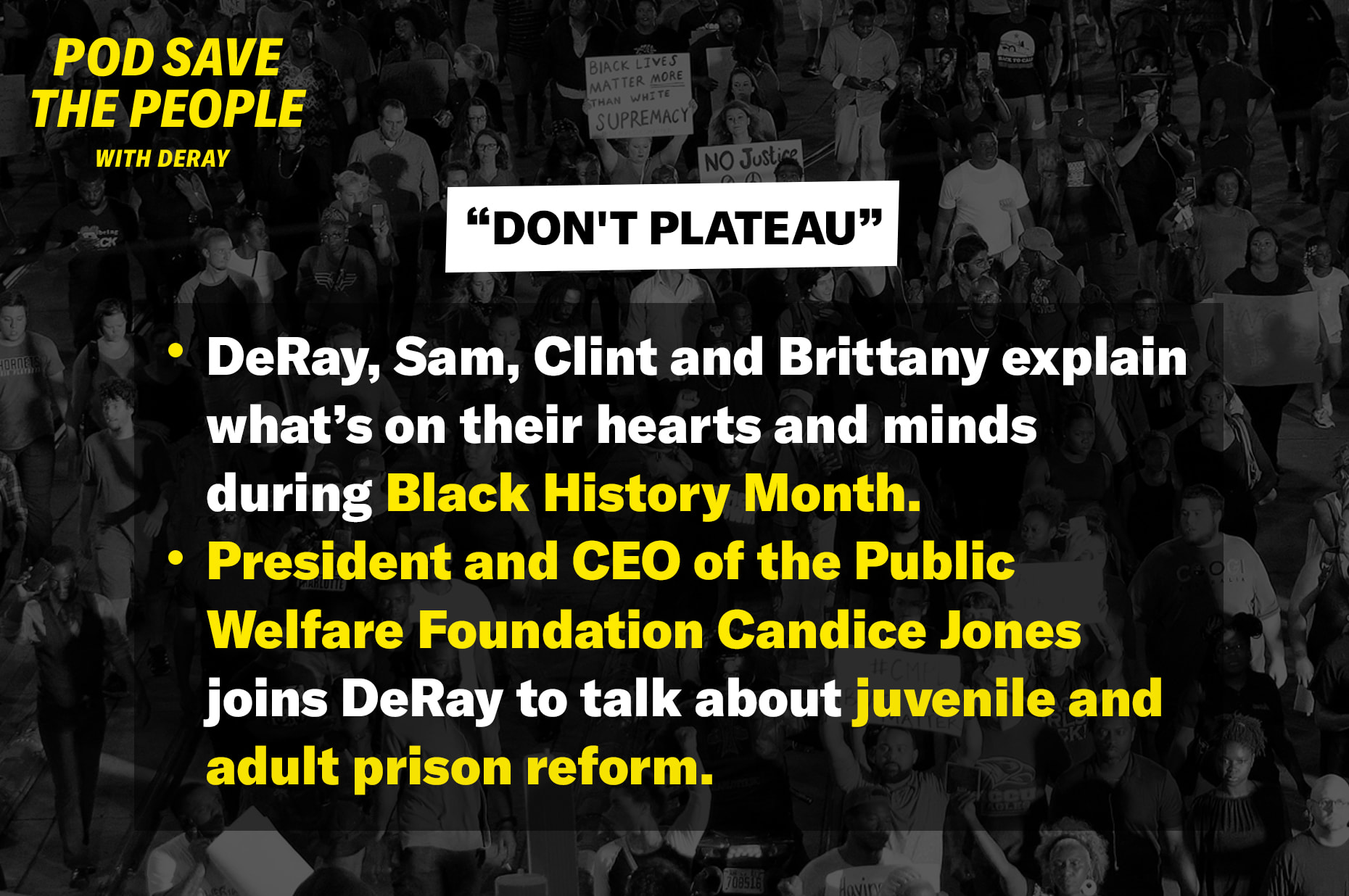 DeRay, Sam, Clint and Brittany explain what’s on their hearts and minds during Black History Month. President and CEO of the Public Welfare Foundation Candice Jones joins DeRay to talk about juvenile and adult prison reform.