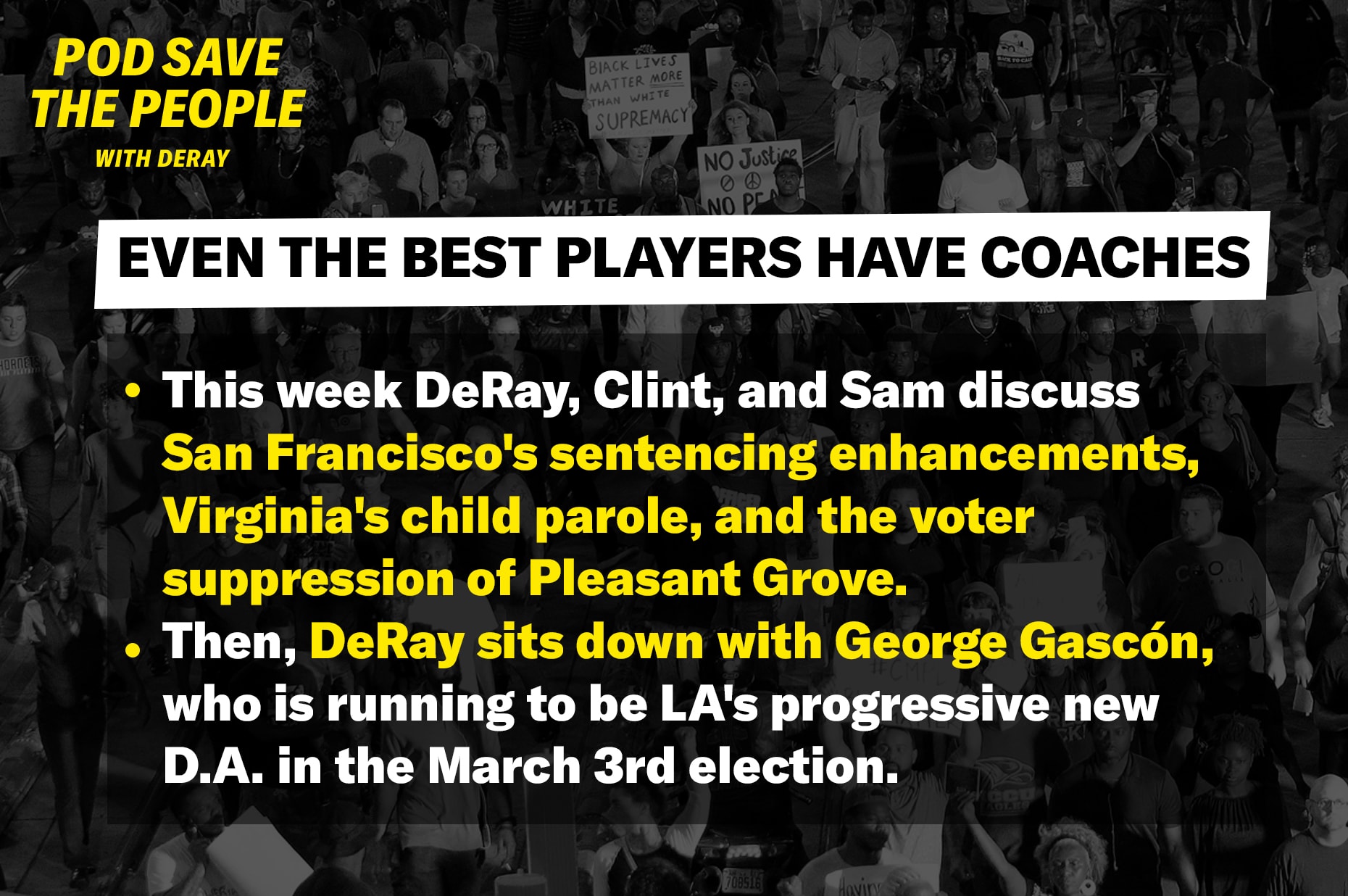 This week DeRay, Clint, and Sam discuss San Francisco’s sentencing enhancements, Virginia’s child parole, and the voter suppression of Pleasant Grove. Then, DeRay sits down with George Gascón, who is running to be LA’s progressive new D.A. in the March 3rd election.