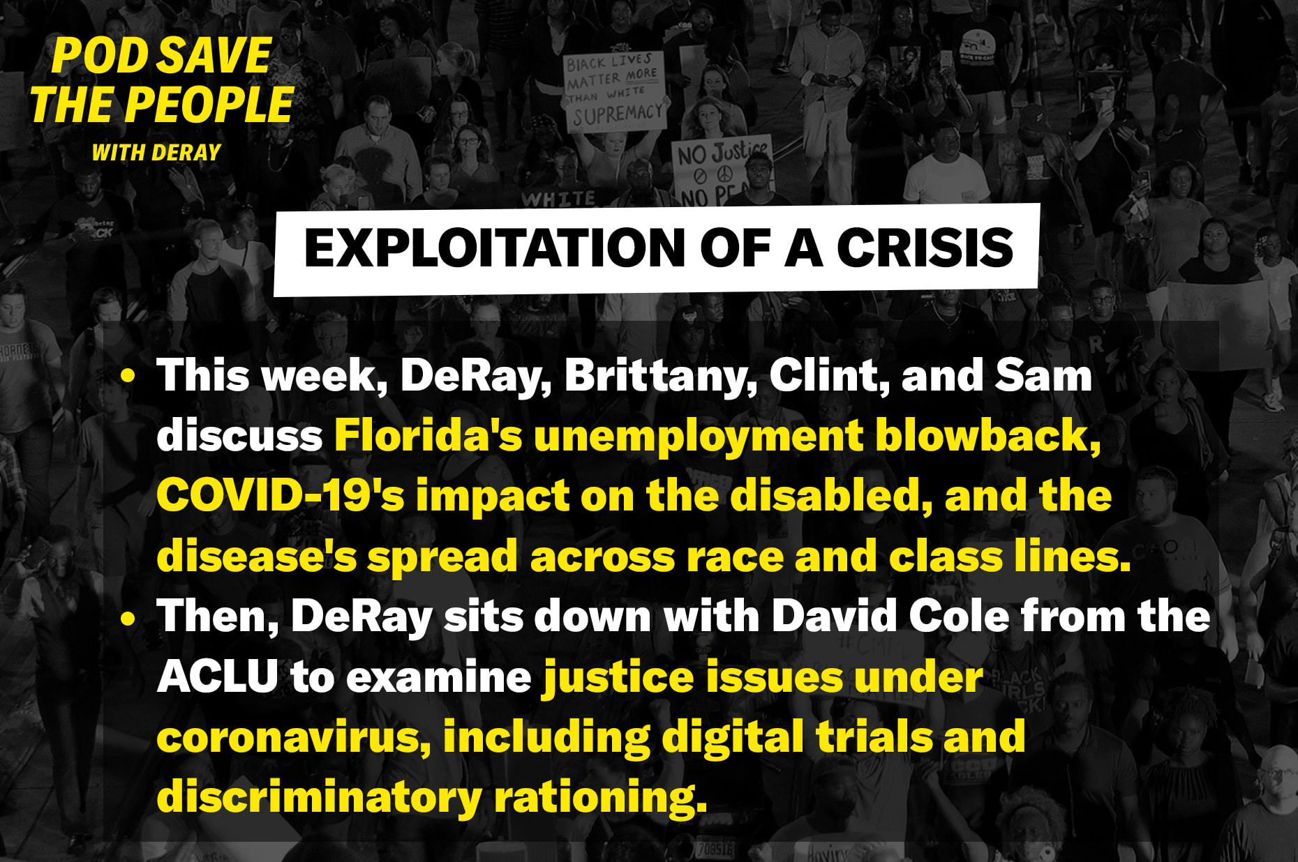 This week, DeRay, Brittany, Clint, and Sam discuss Florida’s unemployment blowback, COVID-19’s impact on the disabled, and the disease’s spread across race and class lines. Then, DeRay sits down with David Cole from the ACLU to examine justice issues under coronavirus, including digital trials and discriminatory rationing.