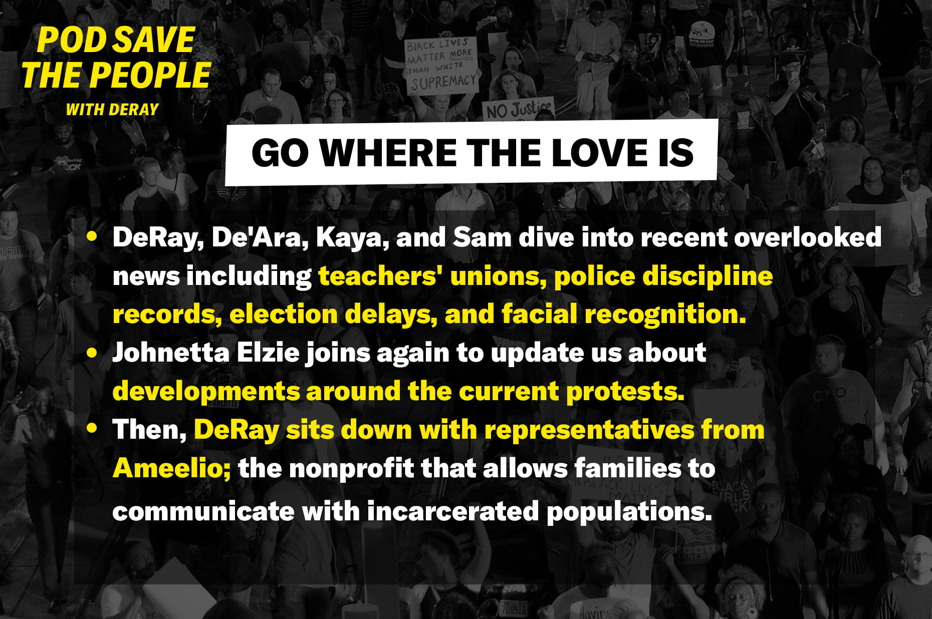 DeRay, De’Ara, Kaya, and Sam dive into recent overlooked news including teachers’ unions, police discipline records, election delays, and facial recognition. Johnetta Elzie joins again to update us about developments around the current protests. Then, DeRay sits down with representatives from Ameelio; the nonprofit that allows families to communicate with incarcerated populations.