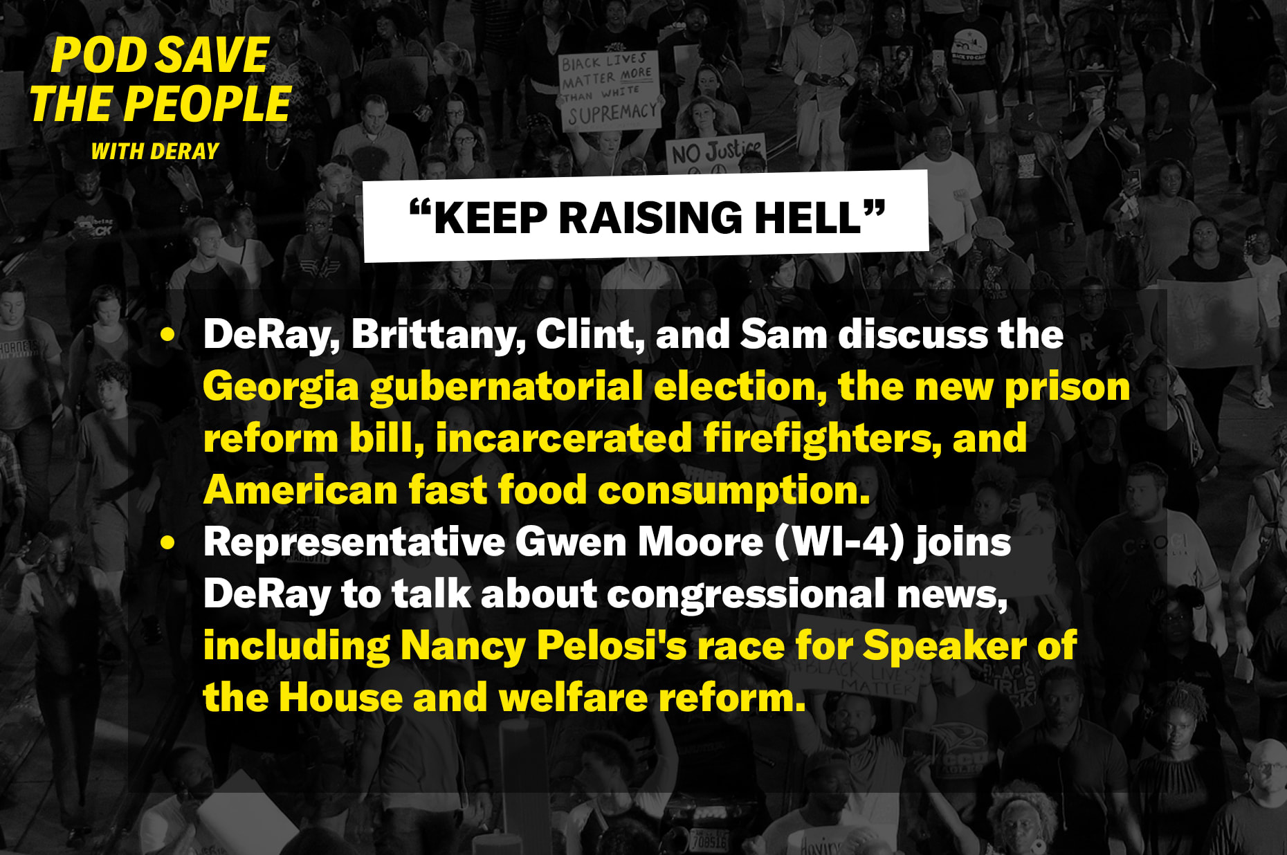 DeRay, Brittany, Clint, and Sam discuss the Georgia gubernatorial election, the new prison reform bill, incarcerated firefighters, and American fast food consumption. Representative Gwen Moore (WI-4) joins DeRay to talk about congressional news, including Nancy Pelosi’s race for Speaker of the House and welfare reform.