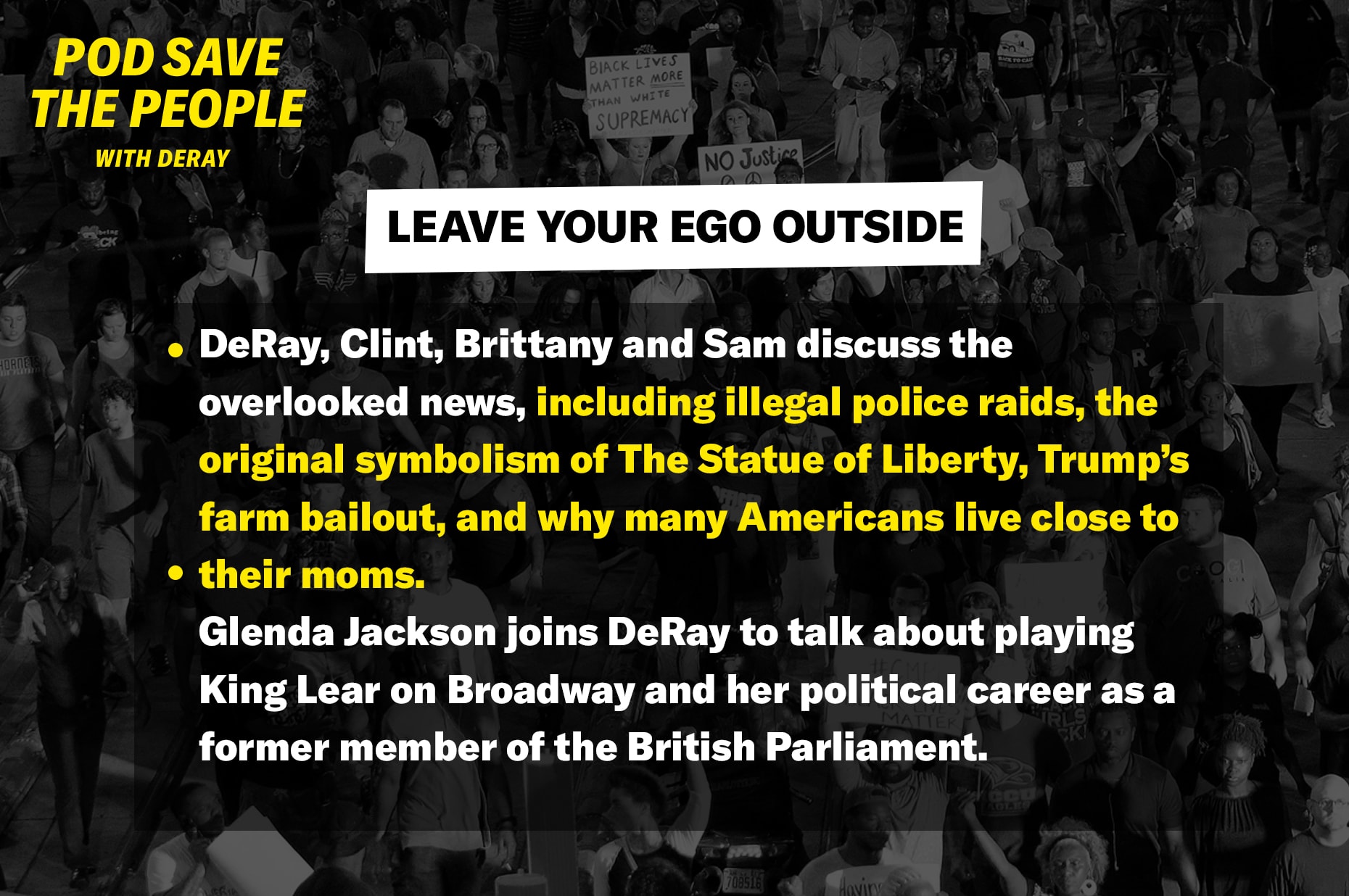 DeRay, Clint, Brittany and Sam discuss the overlooked news, including illegal police raids, the original symbolism of The Statue of Liberty, Trump’s farm bailout, and why many Americans live close to their moms. Glenda Jackson joins DeRay to talk about playing King Lear on Broadway and her political career as a former member of the British Parliament.