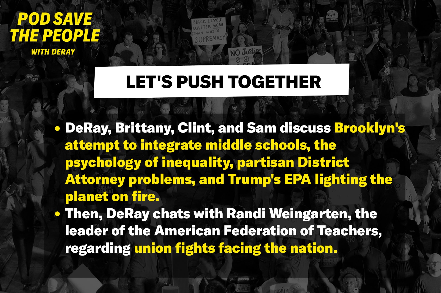 DeRay, Brittany, Clint, and Sam discuss Brooklyn’s attempt to integrate middle schools, the psychology of inequality, partisan District Attorney problems, and Trump’s EPA lighting the planet on fire. Then, DeRay chats with Randi Weingarten, the leader of the American Federation of Teachers, regarding union fights facing the nation.