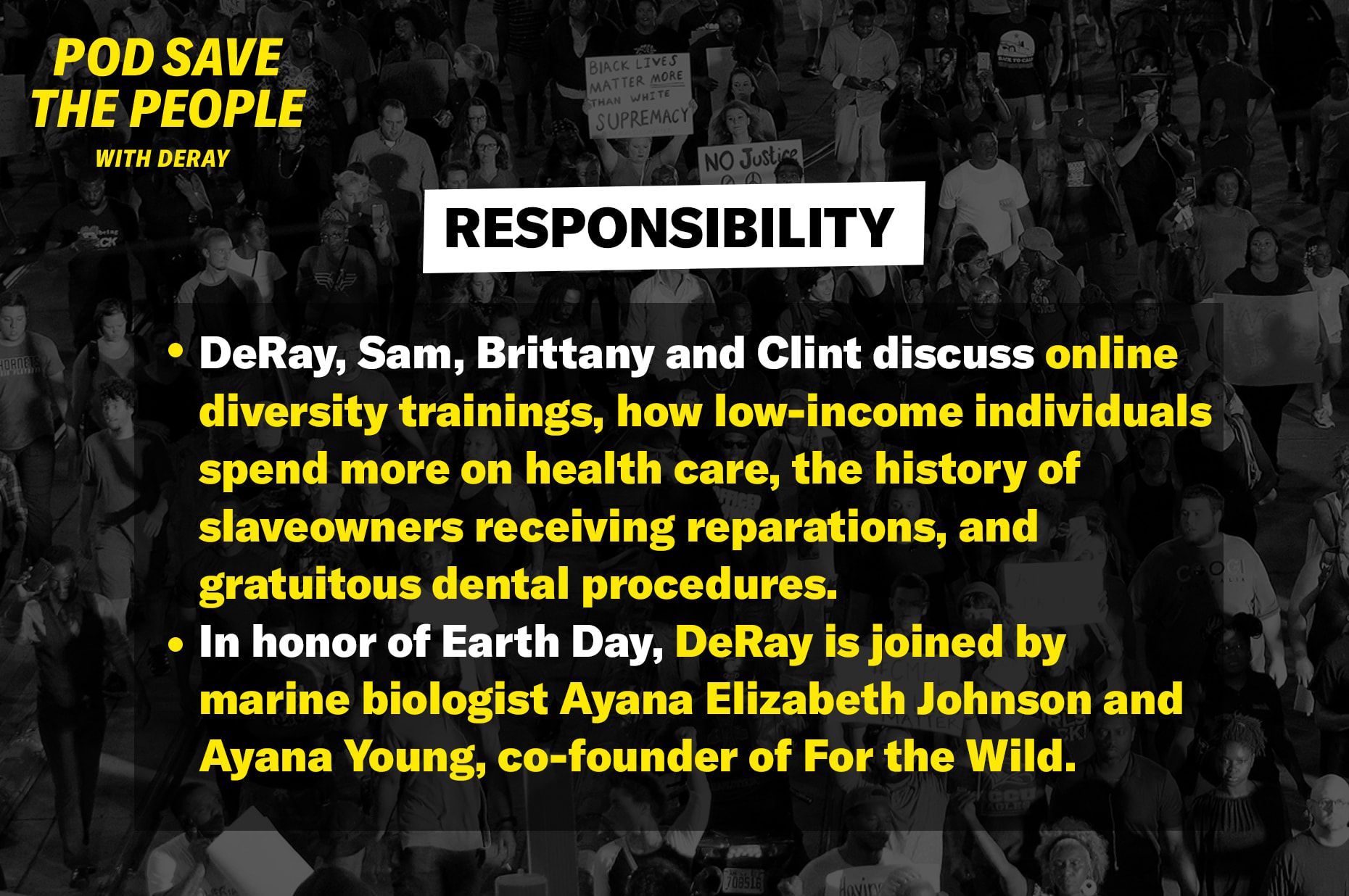 DeRay, Sam, Brittany and Clint discuss online diversity trainings, how low-income individuals spend more on health care, the history of slaveowners receiving reparations, and gratuitous dental procedures. In honor of Earth Day, DeRay is joined by marine biologist Ayana Elizabeth Johnson and Ayana Young, co-founder of For the Wild.