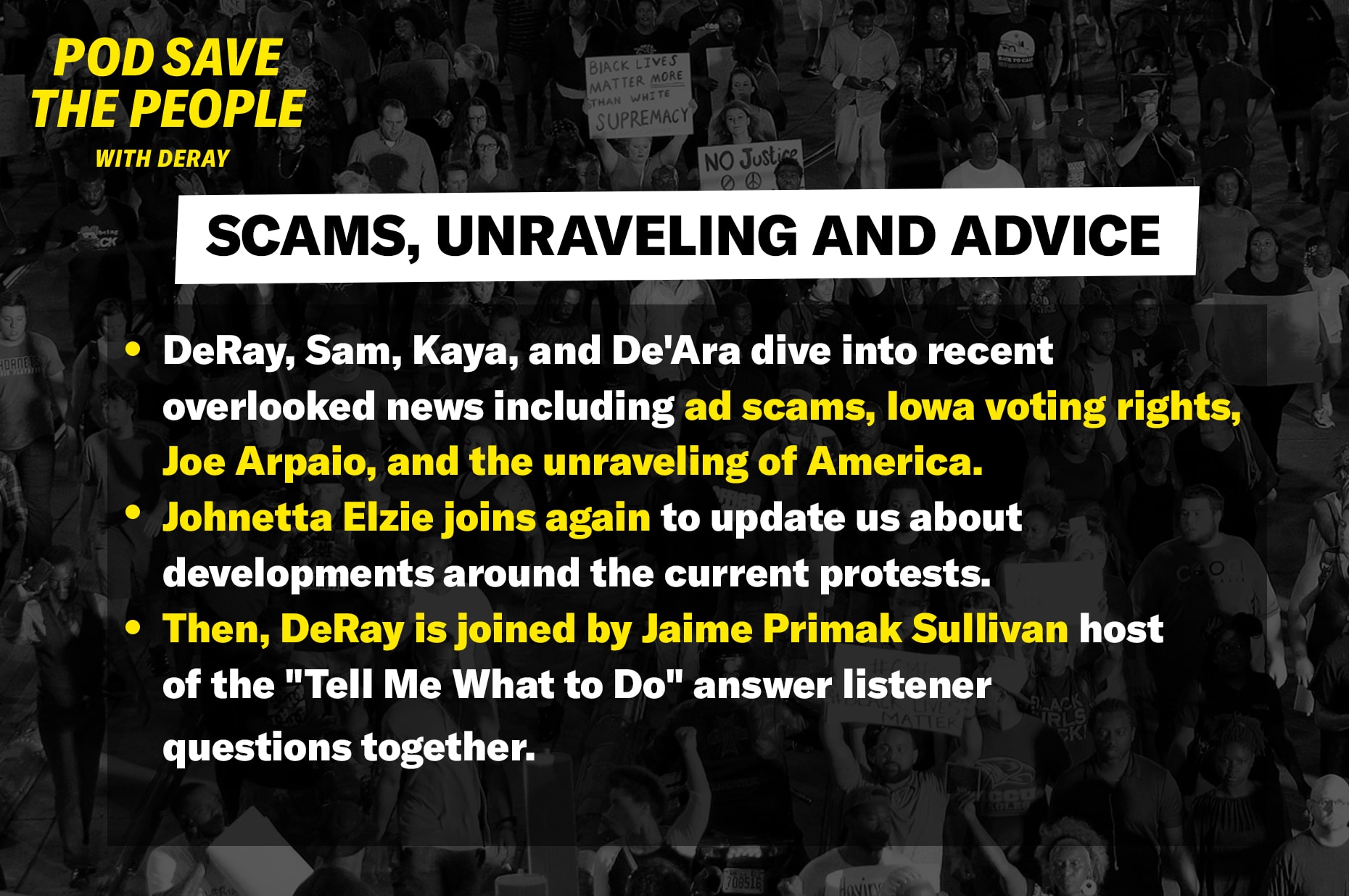DeRay, Sam, Kaya, and De’Ara dive into recent overlooked news including ad scams, Iowa voting rights, Joe Arpaio, and the unraveling of America. Johnetta Elzie joins again to update us about developments around the current protests. Then, DeRay is joined by Jaime Primak Sullivan host of the “Tell Me What to Do” answer listener questions together.