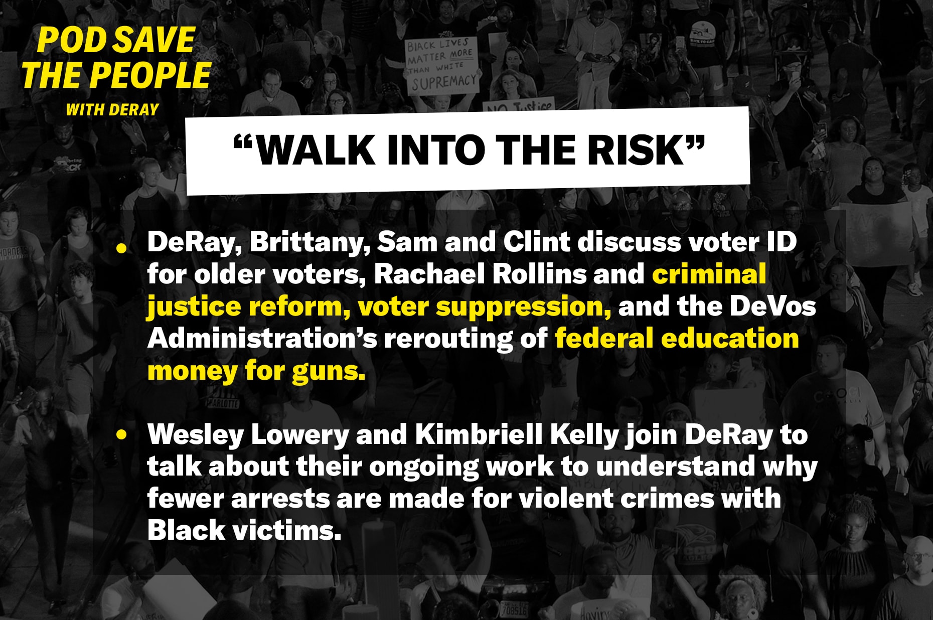 DeRay, Brittany, Sam and Clint discuss voter ID for older voters, Rachael Rollins and criminal justice reform, voter suppression, and the DeVos Administration’s rerouting of federal education money for guns. Wesley Lowery and Kimbriell Kelly join DeRay to talk about their ongoing work to understand why fewer arrests are made for violent crimes with Black victims.