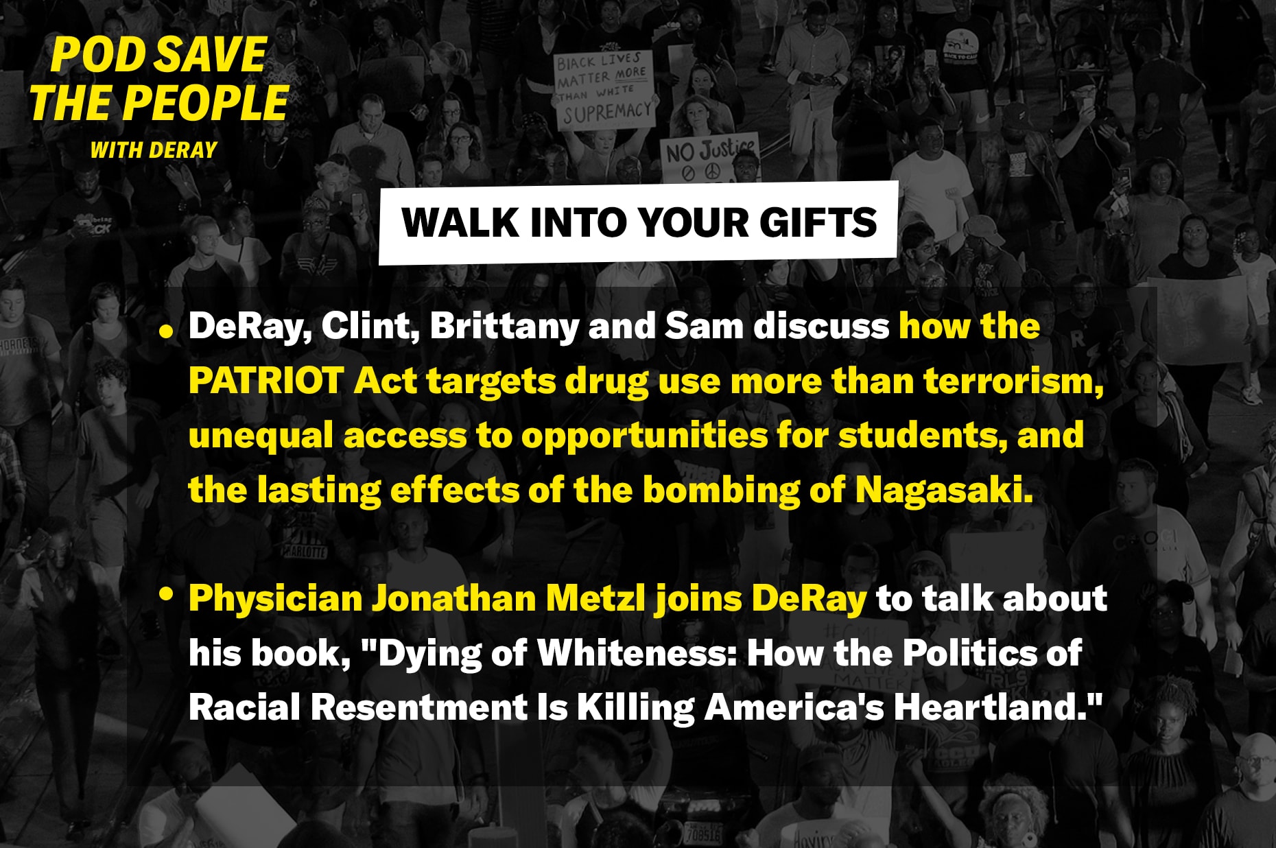 DeRay, Clint and Sam discuss how the PATRIOT Act targets drug use more than terrorism, unequal access to opportunities for students, and the lasting effects of the bombing of Nagasaki. Physician Jonathan Metzl joins DeRay to discuss his book, “Dying of Whiteness: How the Politics of Racial Resentment Is Killing America’s Heartland.”