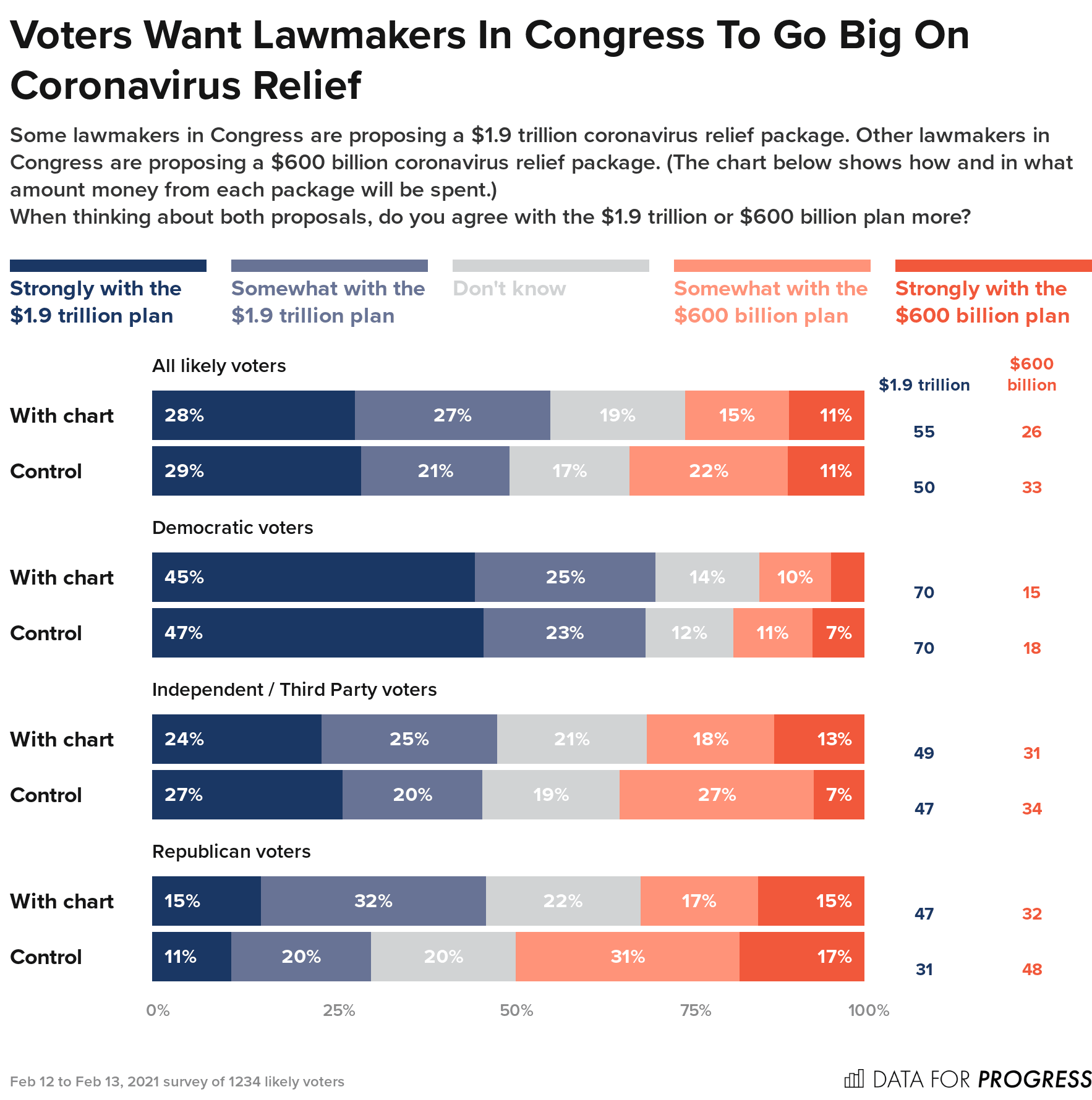 President Biden’s Chief of Staff Ronald Klain seems to share this belief, arguing that Democrats can unify the country and gain support from voters across partisan lines by going bigger and bolder (not smaller) on coronavirus relief. While the GOP argues that a $1.9 trillion stimulus is “divisive,” Data for Progress’ polling shows that Klain and the Biden team are exactly right: the way to unify the country isn’t to go small—it’s to make a huge investment in the American people.