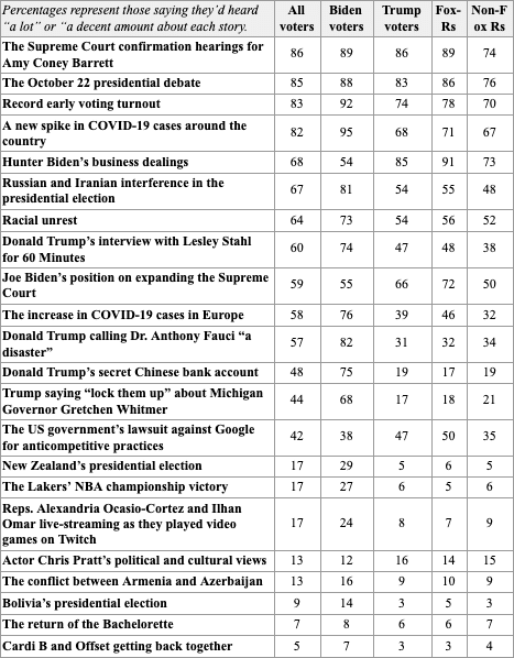 - 39% of Biden voters had been hearing most about COVID, while only 13% of Trump voters had. There was a 4-point gap between Fox and Non-Fox Republicans on COVID.
