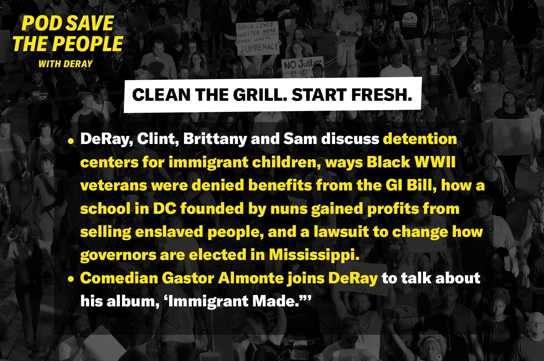 DeRay, Clint, Brittany and Sam discuss detention centers for immigrant children, ways Black WWII veterans were denied benefits from the GI Bill, how a school in DC founded by nuns gained profits from selling enslaved people, and a lawsuit to change how governors are elected in Mississippi. Comedian Gastor Almonte joins DeRay to talk about his album, ‘Immigrant Made.”’
