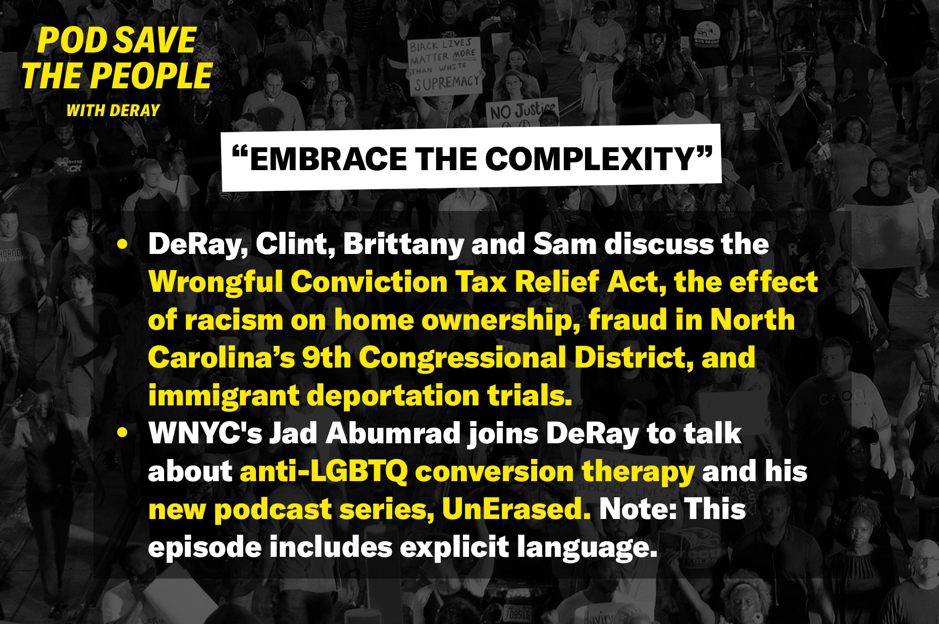 DeRay, Clint, Brittany and Sam discuss the Wrongful Conviction Tax Relief Act, the effect of racism on home ownership, fraud in North Carolina’s 9th Congressional District, and immigrant deportation trials. WNYC’s Jad Abumrad joins DeRay to talk about anti-LGBTQ conversion therapy and his new podcast series, UnErased. Note: This episode includes explicit language.