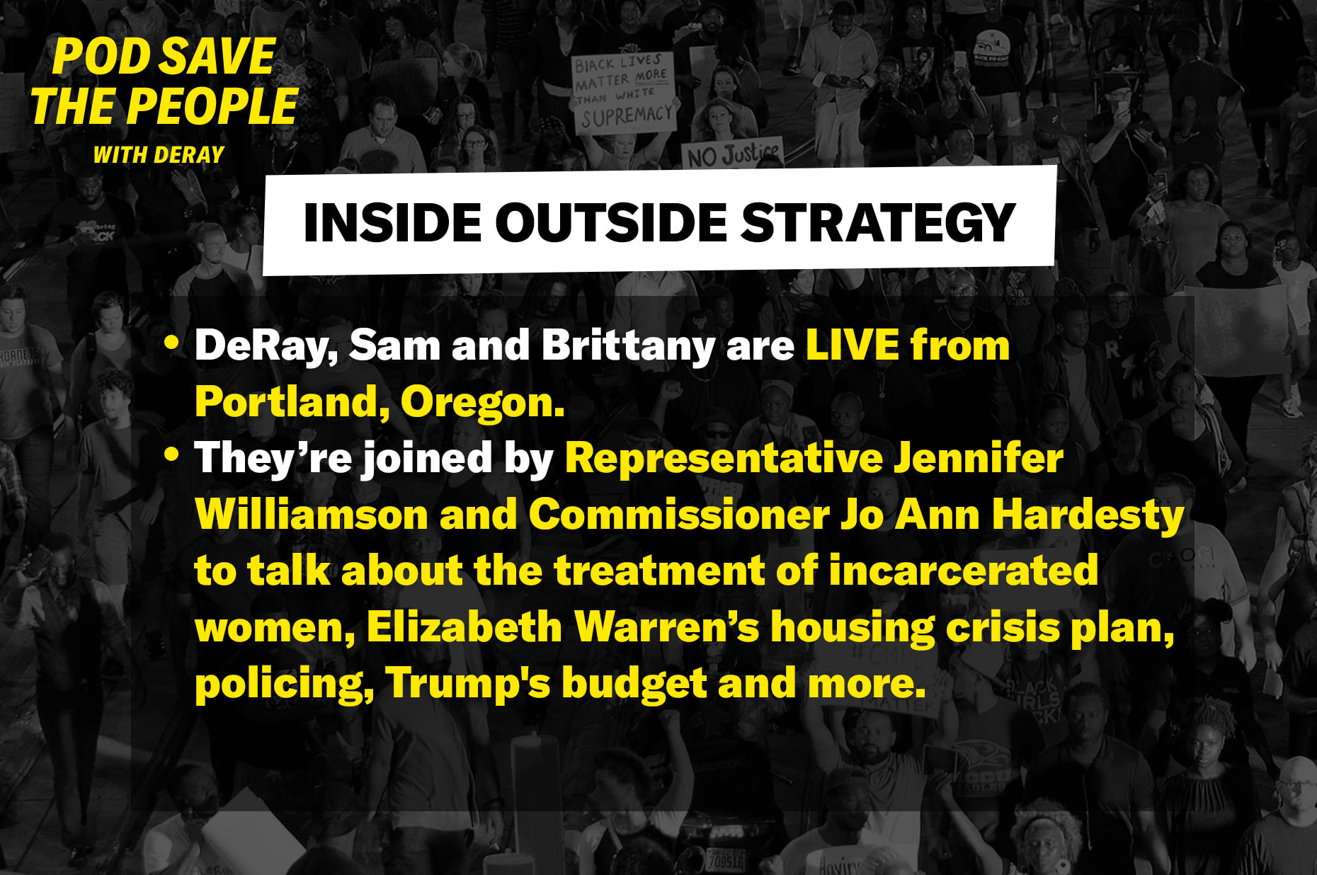 DeRay, Sam and Brittany are LIVE from Portland, Oregon. They’re joined by Representative Jennifer Williamson and Commissioner Jo Ann Hardesty to talk about the treatment of incarcerated women, Elizabeth Warren’s housing crisis plan, policing, Trump’s budget and more.