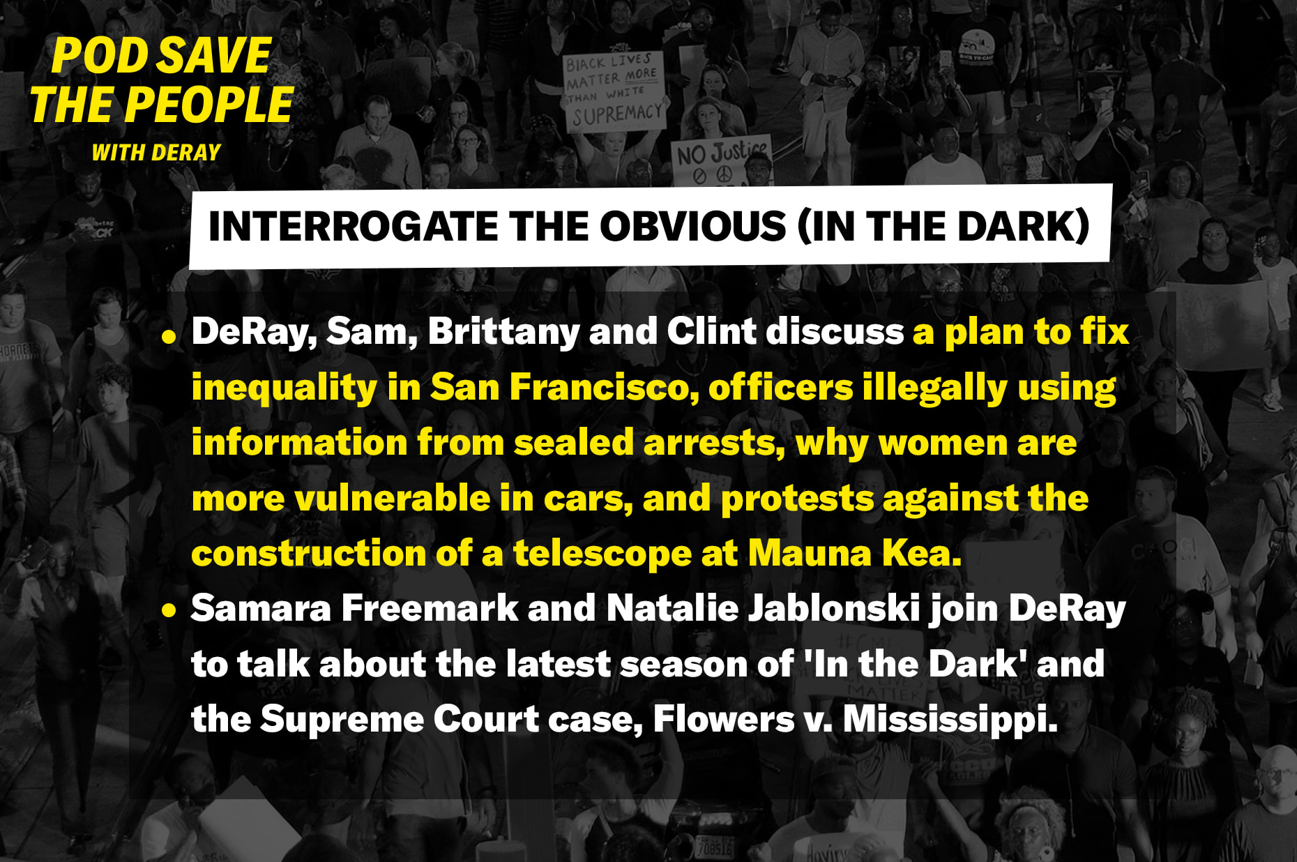 DeRay, Sam, Brittany and Clint discuss a plan to fix inequality in San Francisco, officers illegally using information from sealed arrests, why women are more vulnerable in cars, and protests against the construction of a telescope at Mauna Kea. Samara Freemark and Natalie Jablonski join DeRay to talk about the latest season of ‘In the Dark’ and the Supreme Court case, Flowers v. Mississippi.