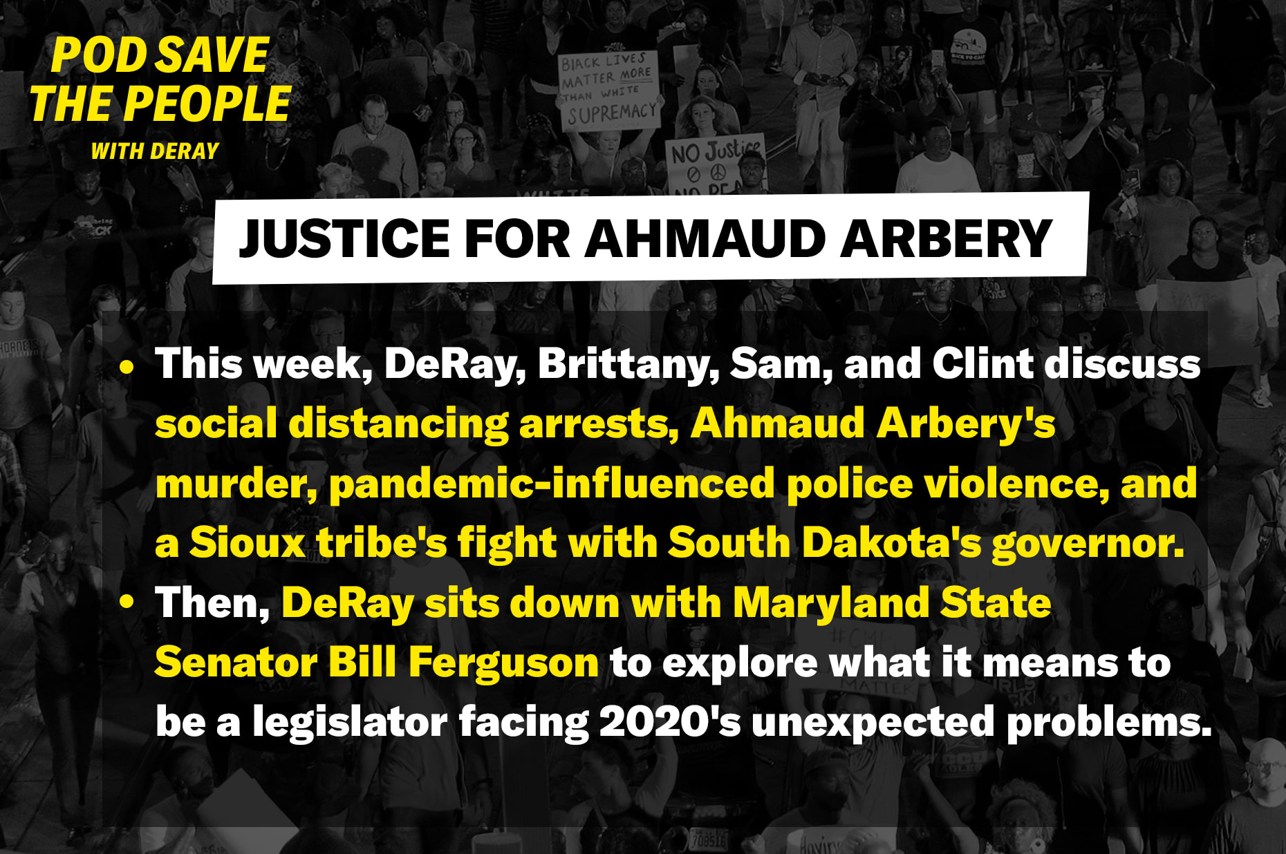 This week, DeRay, Brittany, Sam, and Clint discuss social distancing arrests, Ahmaud Arbery’s murder, pandemic-influenced police violence, and a Sioux tribe’s fight with South Dakota’s governor. Then, DeRay sits down with Maryland State Senator Bill Ferguson to explore what it means to be a legislator facing 2020’s unexpected problems.