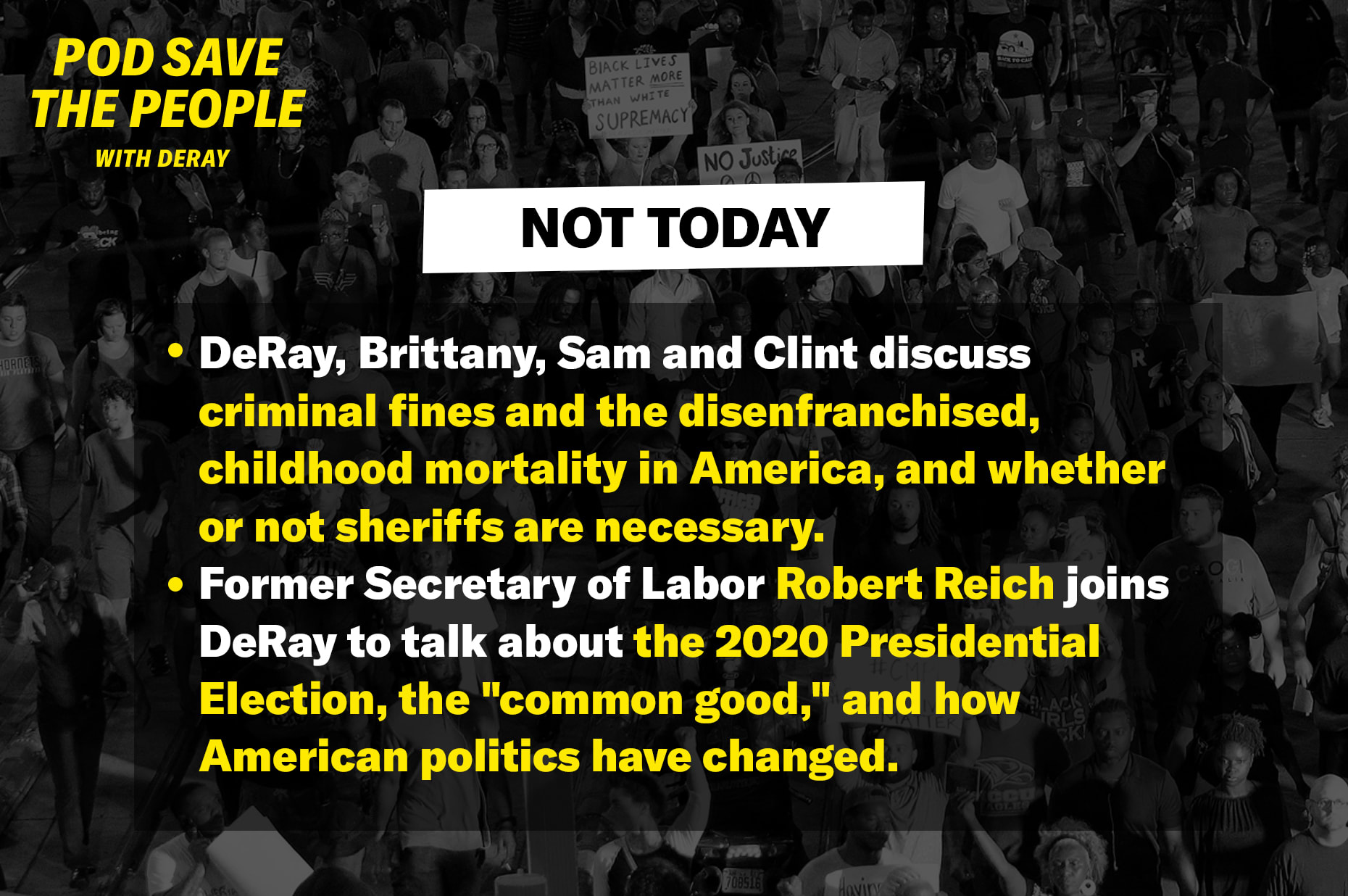 DeRay, Brittany, Sam and Clint discuss criminal fines and the disenfranchised, childhood mortality in America, and whether or not sheriffs are necessary. Former Secretary of Labor Robert Reich joins DeRay to talk about the 2020 Presidential Election, the “common good,” and how American politics have changed.