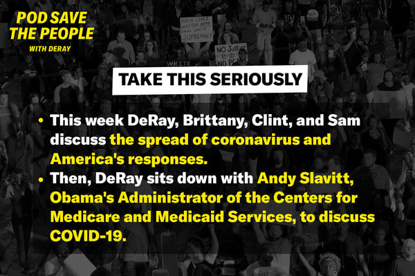This week DeRay, Brittany, Clint, and Sam discuss the spread of coronavirus and America’s responses regarding law enforcement, prison populations, border enforcement, and the elevated risked to the African-American population. Then, DeRay sits down with Andy Slavitt, Obama’s Administrator of the Centers for Medicare and Medicaid Services, to discuss COVID-19.