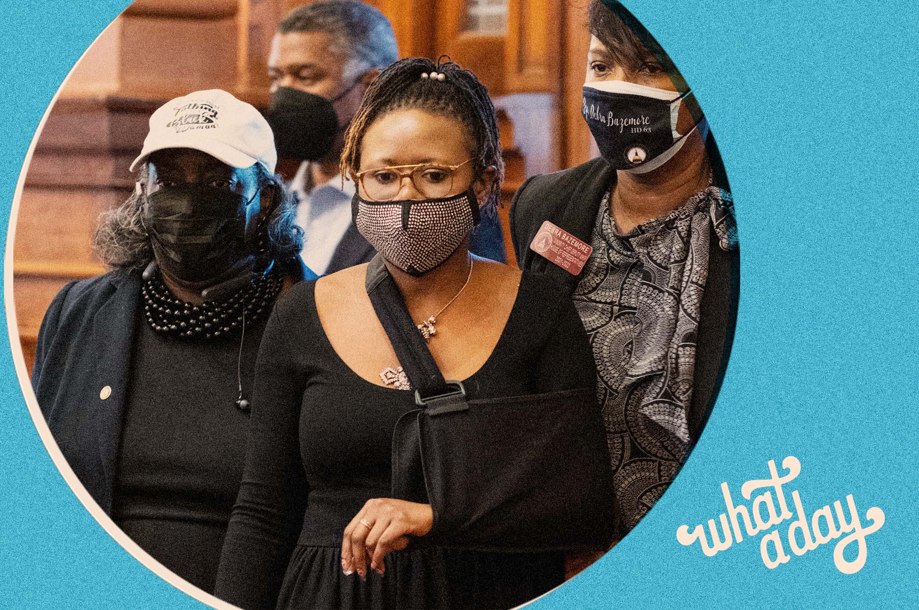 Erin Ryan: Exactly—before they’re allowed to exercise their First Amendment rights. Like every church is, like surrounded by a high fence that people have to scale. Like, come on! We’ll get to that federal proposal in a moment. But other states like Iowa and Texas have already passed their own bills that make it harder to vote: from things like cutting back the days and hours that people can go in person, to limiting who can mail in their ballot. This isn’t a coincidence, right?