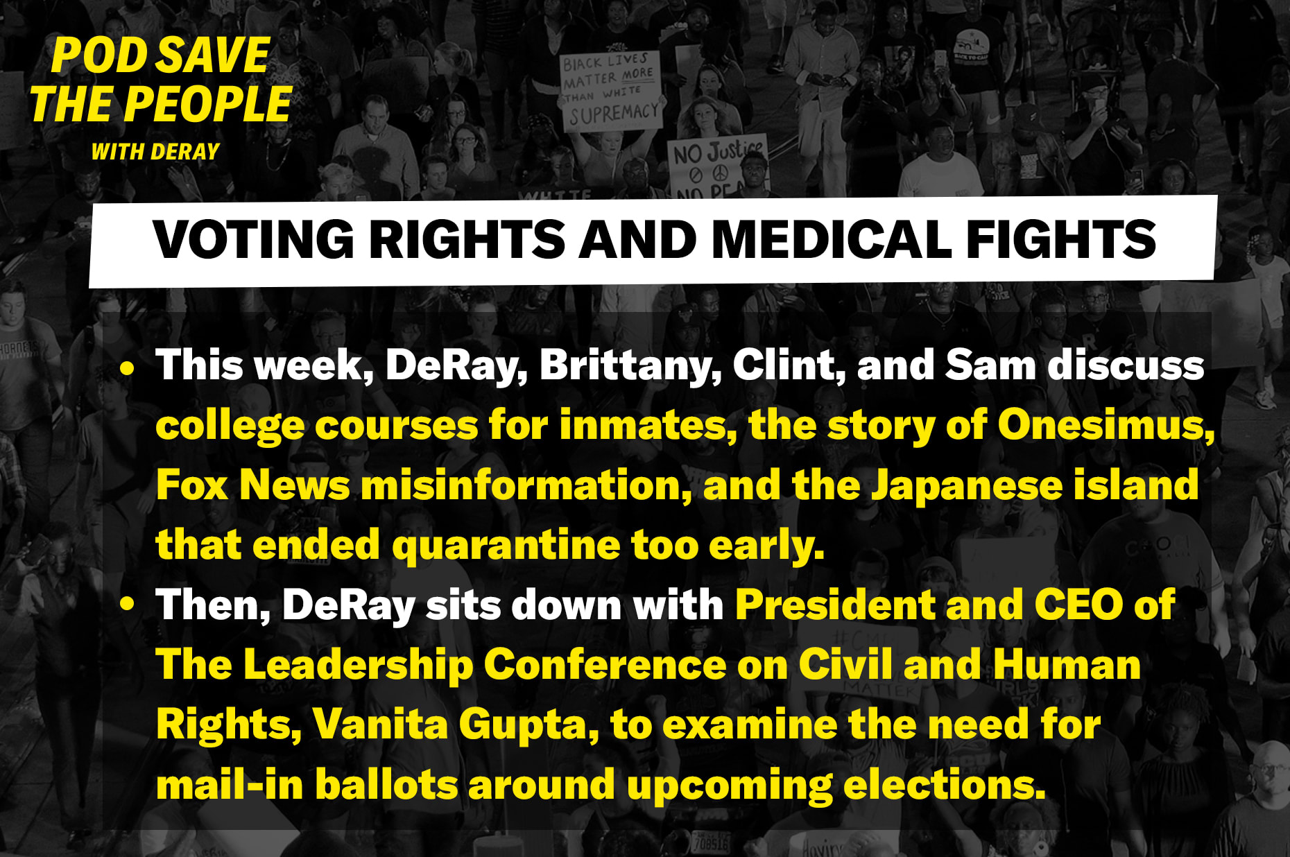 This week, DeRay, Brittany, Clint, and Sam discuss college courses for inmates, the story of Onesimus, Fox News misinformation, and the Japanese island that ended quarantine too early. Then, DeRay sits down with civil rights lawyer Vanita Gupta to examine the need for mail-in ballots around upcoming elections.