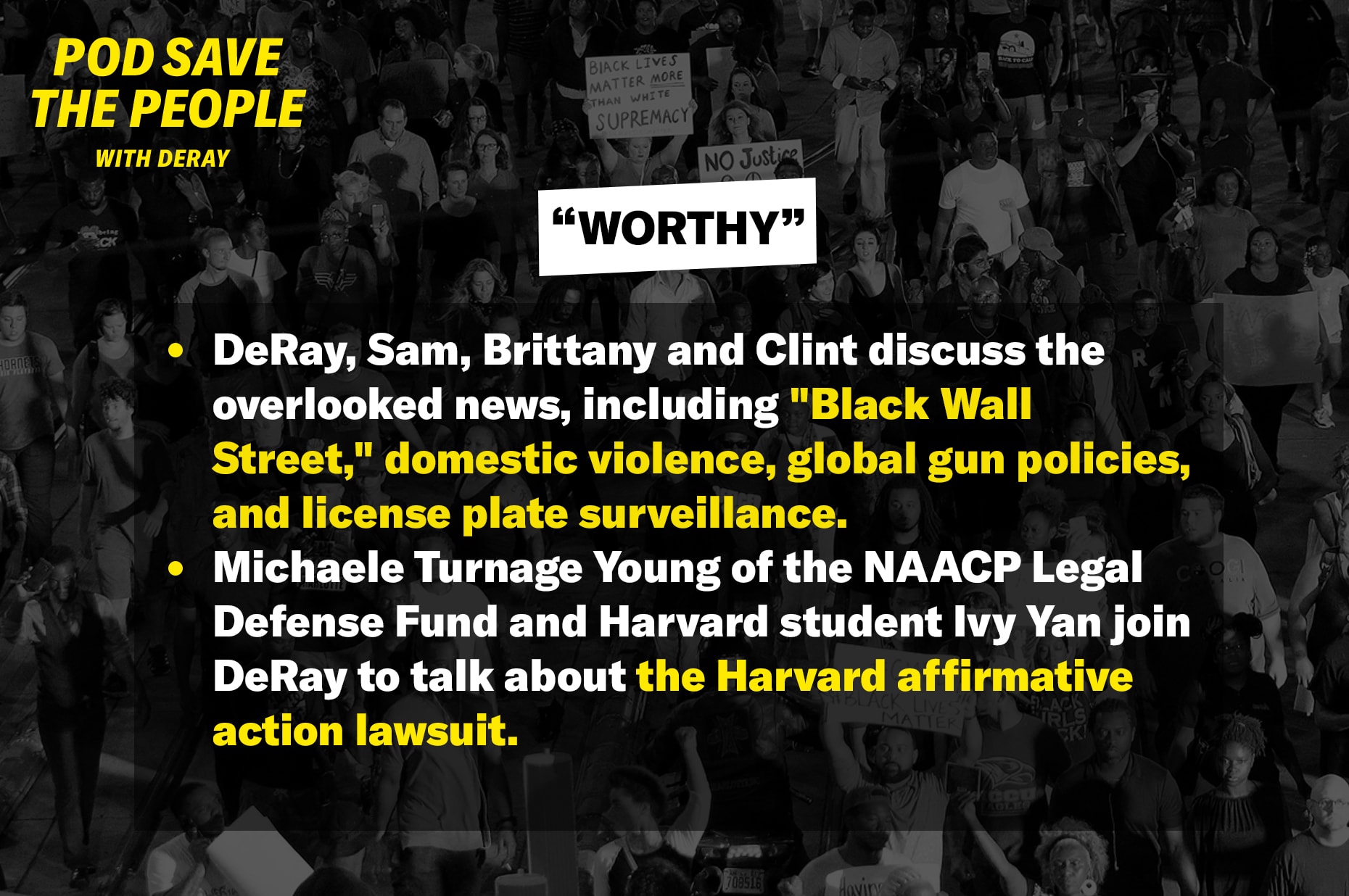 DeRay, Sam, Brittany and Clint discuss the overlooked news, including “Black Wall Street,” domestic violence, global gun policies, and license plate surveillance. Michaele Turnage Young of the NAACP Legal Defense Fund and Harvard student Ivy Yan join DeRay to talk about the Harvard affirmative action lawsuit.
