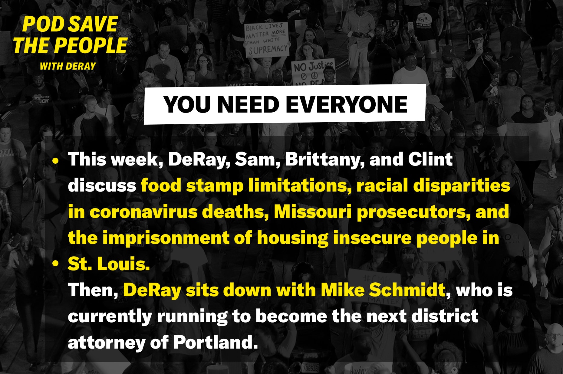 This week, DeRay, Sam, Brittany, and Clint discuss food stamp limitations, racial disparities in coronavirus deaths, Missouri prosecutors, and the imprisonment of housing insecure people in St. Louis. Then, DeRay sits down with Mike Schmidt, who is currently running to become the next district attorney of Portland.